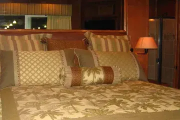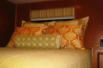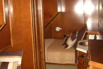 -Private master suite with king-sized bed and full bath. Two upper level suites with queen-sized beds. One private cuddie cabin with a queen-sized bed, twin-sized bed and sink. Sectional sofa-sleeper (full-sized) in front salon. Additional full bath across from upper level suites. Deluxe accommodations for 11 (sleeping for 21 adults).