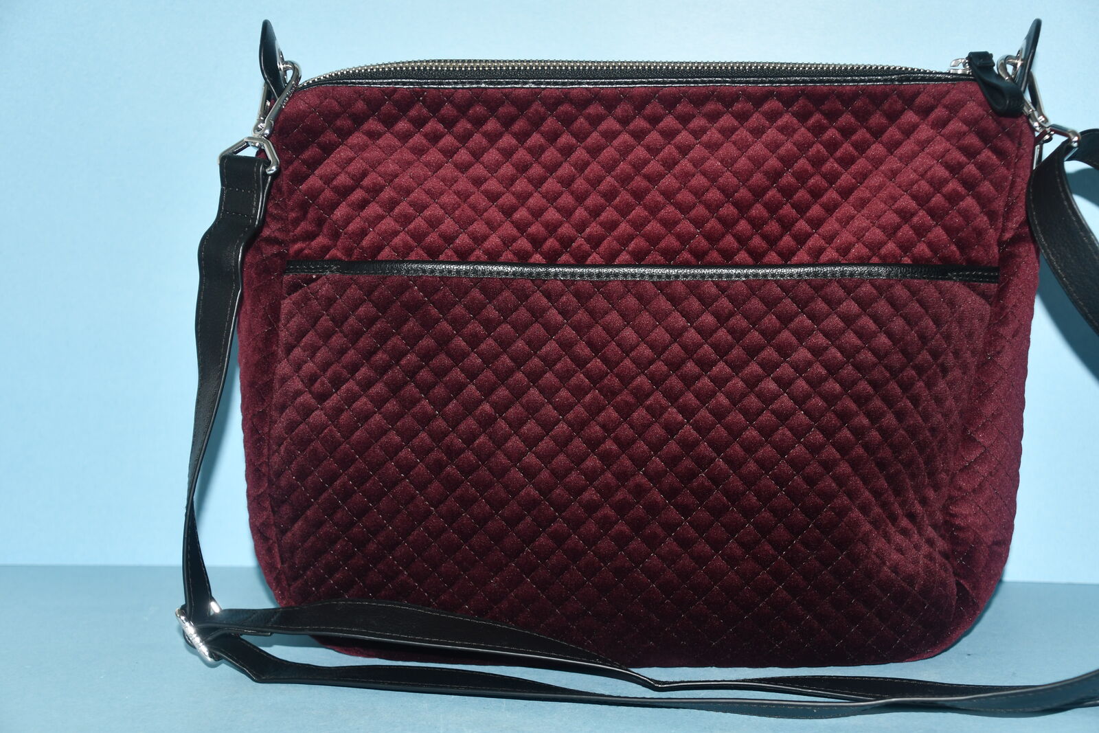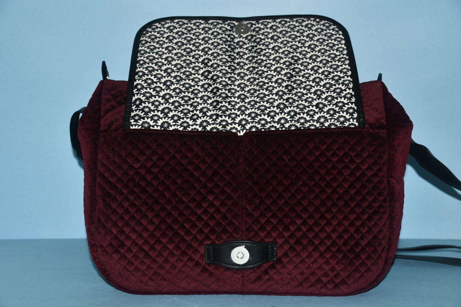This VERA BRADLEY QUILTED HANDBAG/TOTE is about 12" x 10" x 4". It has a FLAP that opens to 2 open compartments in the front. The BACK has an open compartment. The TOP is ZIPPERED and opens to 2 open compartments and a zippered compartment. It has an adjustable strap. Our home is smoke free. Questions??? Please ask. We are located in Plain City. Cash only please.