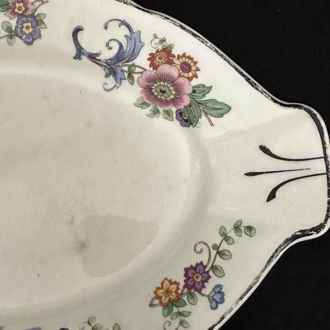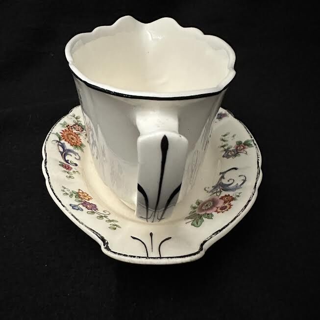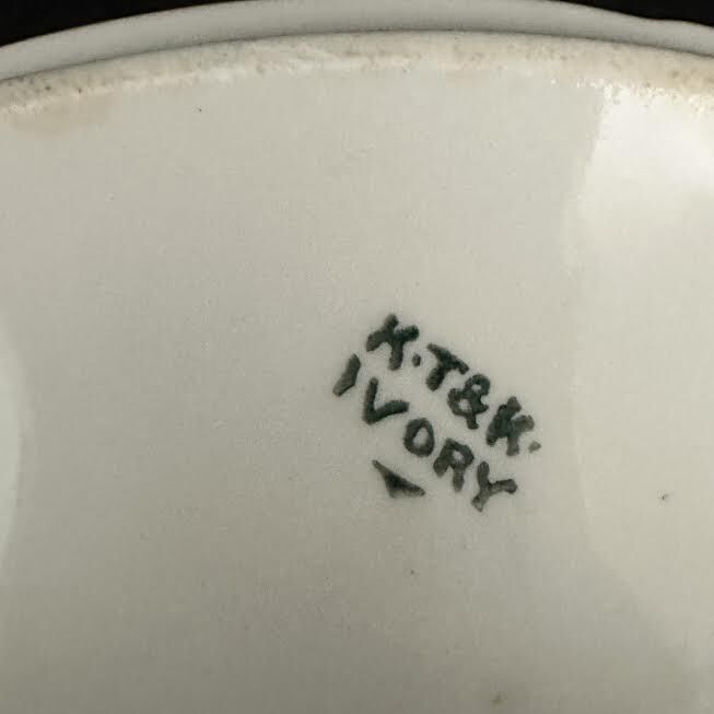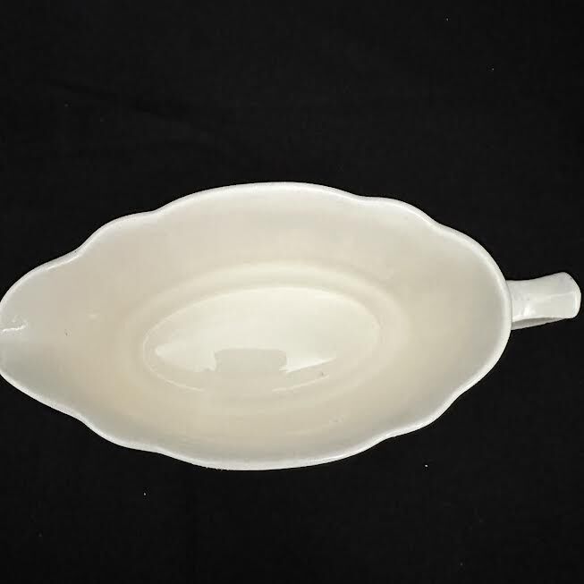 VenmoK. T. & K. Ivory gravy boat and plate. Vintage. Floral design front and back on white background. Identical design on plate. Thin black trim on rim and handle and rim of serving plate. Boat measures 7.5” x 3.5” x 3”D. (includes handle). Plate measures 8.5” x 5.5”. Excellent vintage. No chips, cracks or crazing. Some wear on black trim. Weight 1.2 lbs.