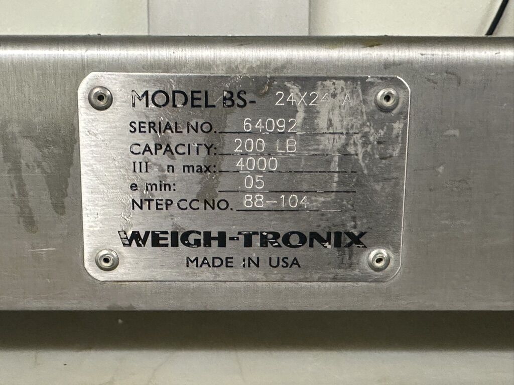 Weigh-tronix 24"x24 " scale, 200 lb capacity, made in USA perfect condition spray down safe all stainless steel construction. Inspected by weights and measures. Stops prevent over loading the sensor.