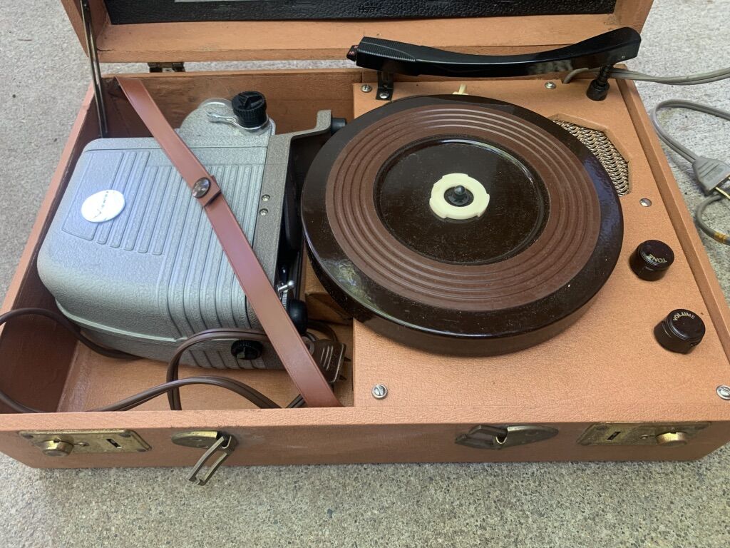 I’ve sold a few different types of these over the years. This one is in the best shape I’ve seen cosmetically. However, it needs some tune up. The record player spins but the volume starts to buzz the louder you turn it. I can’t test the projector cause it is missing the bulb. The handle on the case is missing. Thanks for looking!
