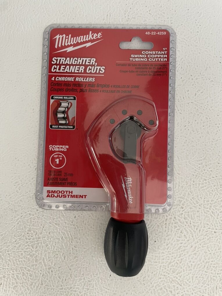 The Milwaukee 1 in. Constant Swing Copper Tubing Cutter is engineered for straighter, cleaner cuts. A 4 Roller Design delivers accurate cuts and prevents walking. For added durability and extended performance, Chrome Rollers provide best in class rust protection. Tool-free blade change allows easy blade replacement on the jobsite.
