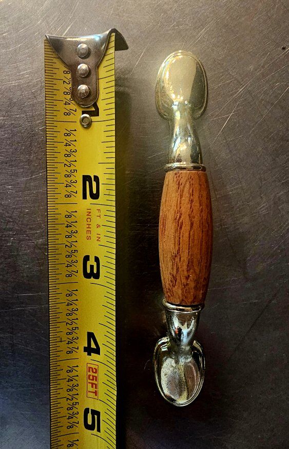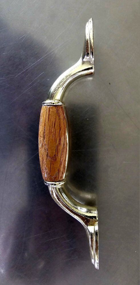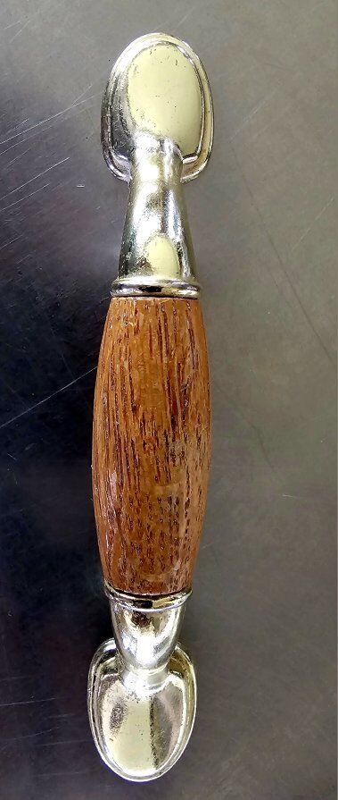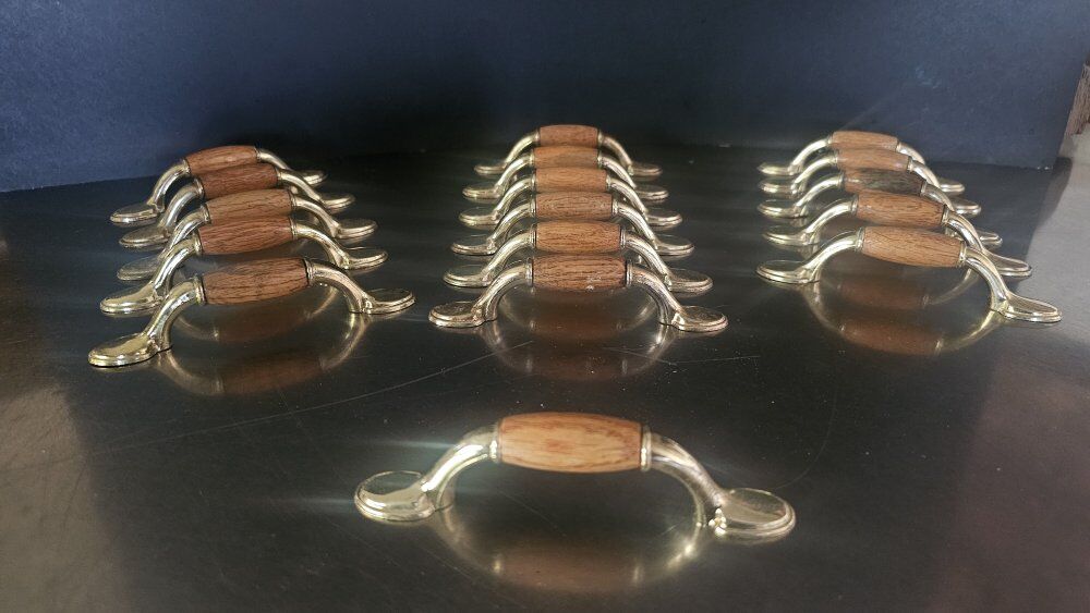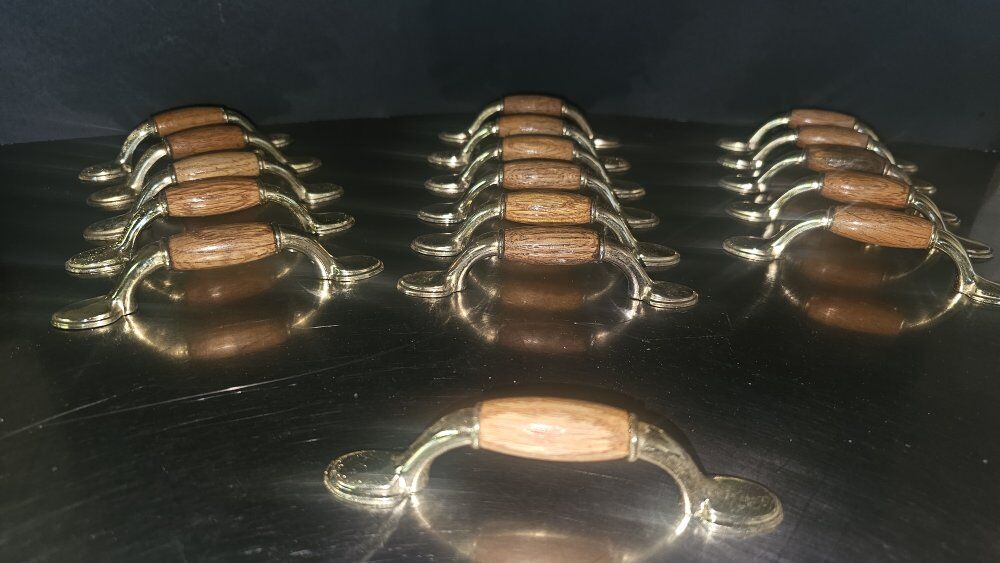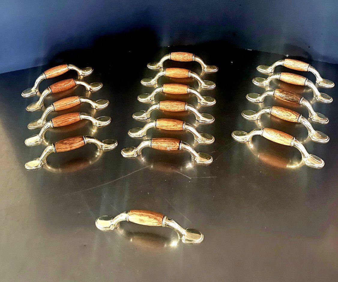Vintage 5" - (3" CENTERS) with WOOD insert and shiny gold-colored METAL drawer PULLS/CUPBOARD HANDLES hardware. All are in great used/vintage shape. Selling 16 pieces IN ALL, PLUS, ONE for FREE (due to discoloration on the wood) so 17 TOTAL!
