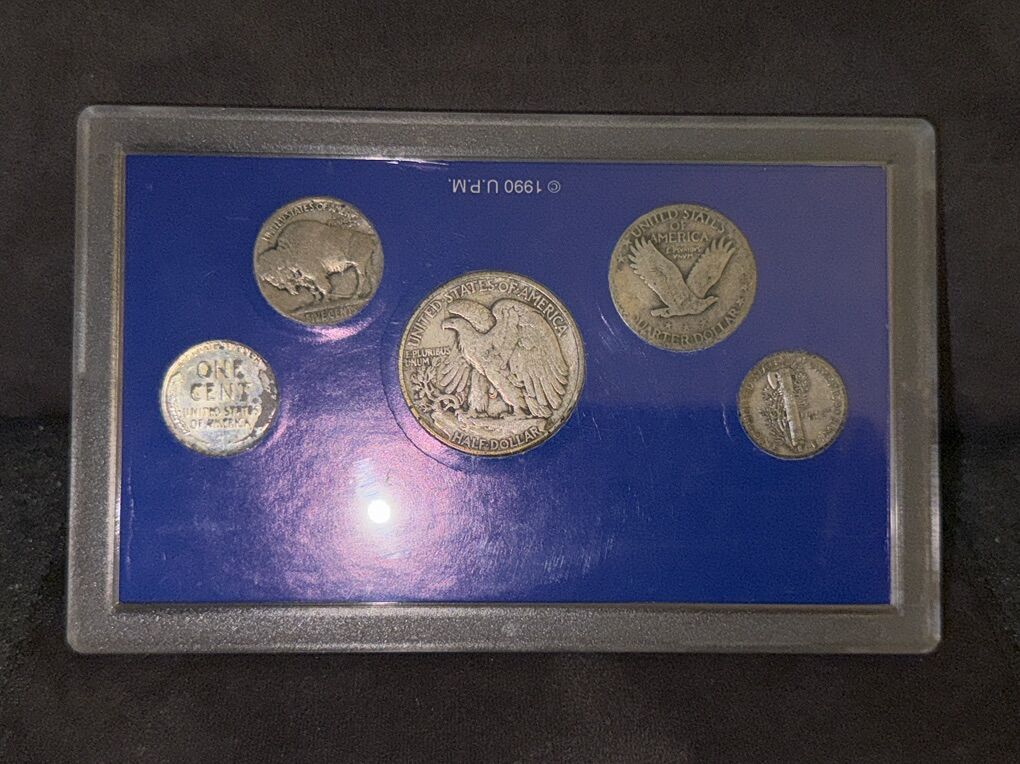 1943 steel penny 1936 buffalo nickel 1941 walking liberty half dollar 1928 standing liberty quarter 1943 mercury dime