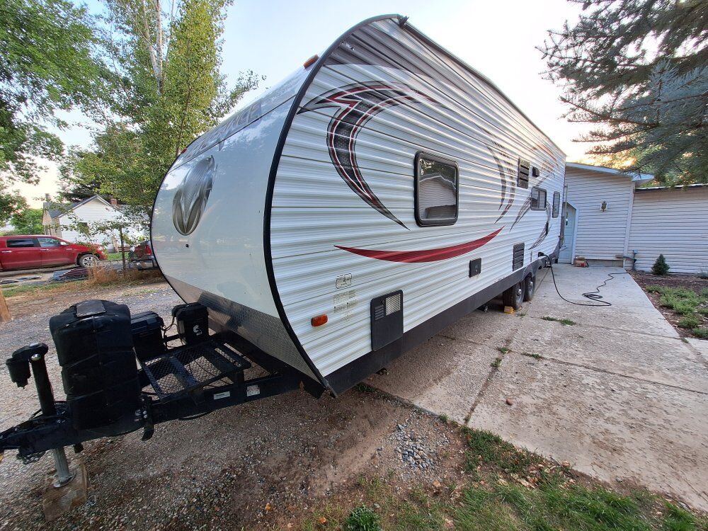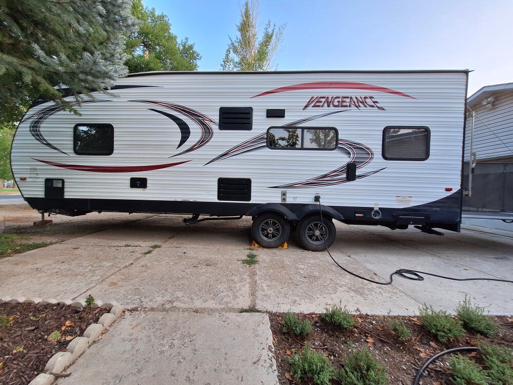 2015 Forest River Vengence 25v Toy hauler. Exterior length 30'6", 102" wide body. Dry weight:6498lbs, GVWR: 9985lbs. Cargo area: 68in wide x 160 long 81 tall. New tires, 3 year old batteries.evrything works. Roof in excellent shape, no leaks. Master bedroom with queen bed. Two queen beds in cargo area. 21ft power awning with led lights. Norcold fridge/freezer, domestic furnace/ac unit. Fresh water tank 50 gal/ grey 38 gal/ black 38 gal/ gas tank 30 gal. Great condition clean title toy hauler.