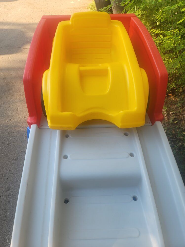 Water resistant 30-in. high platform with safety rails The non-slip step ramp lets children push the coaster car to the platform peak all by themselves 14 feet of track