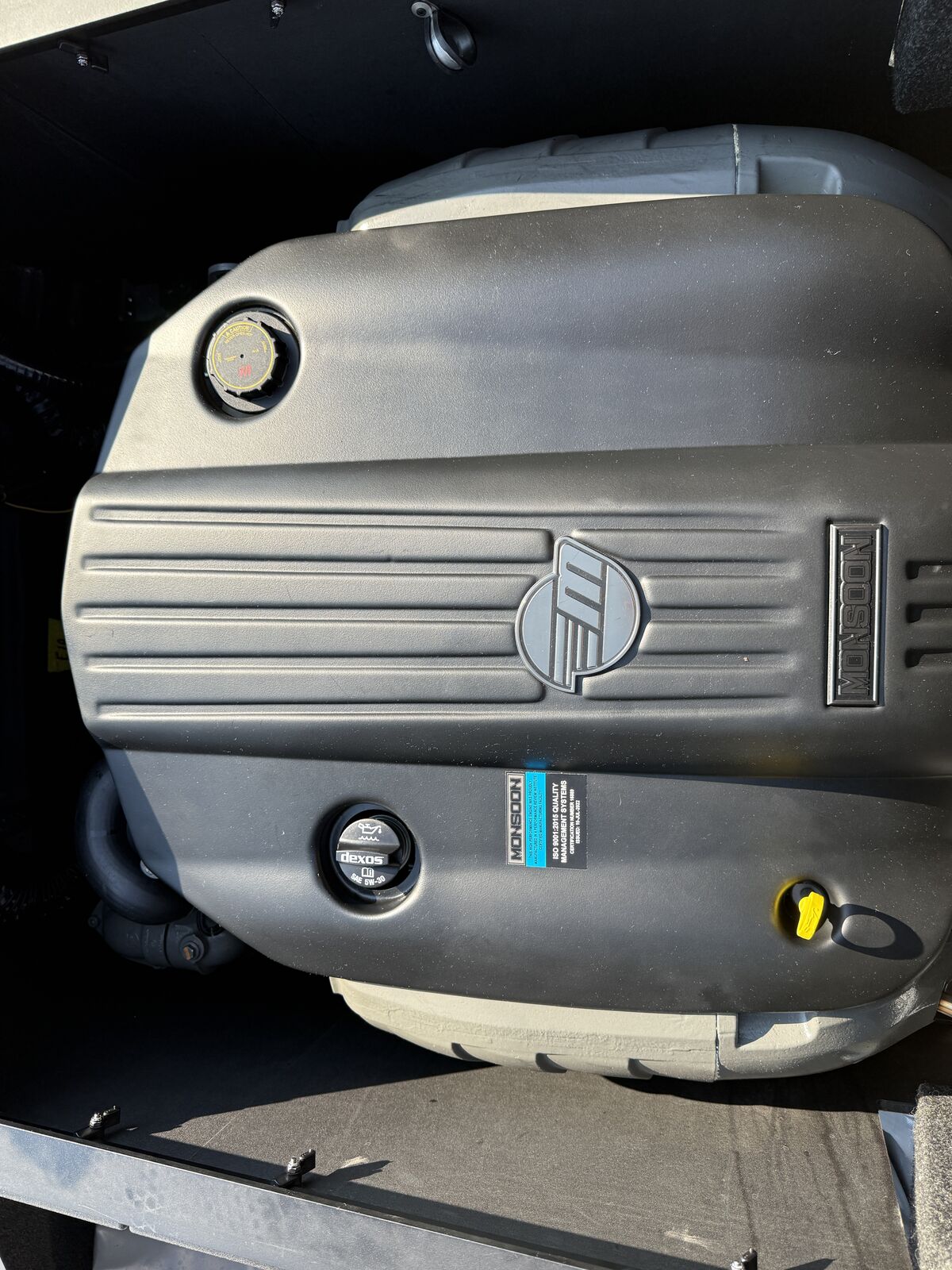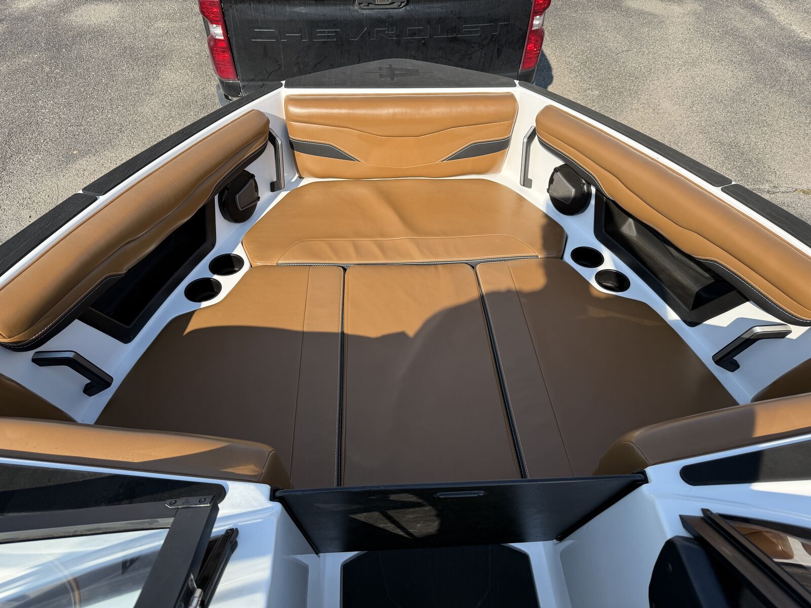Other features include: Stereo sound pack 2 (2 tower speakers, sub, and speakers throughout), Surf band remote, Power Wedge III, Surf Pipe Exhaust, High Altitude Prop, M5DI motor, Sliding middle seat, Ample Storage under seats and rear lockers, Bimini shade top with storage to stow surf boards, 2 board racks, towing cover, Wind Dam, Transom Stereo remote, Dual Batteries with easy access switch, Life Jacket warming tray, Depth Finder, Water & Air temperature gauges, Bluetooth, and 2-12 volt outlets.