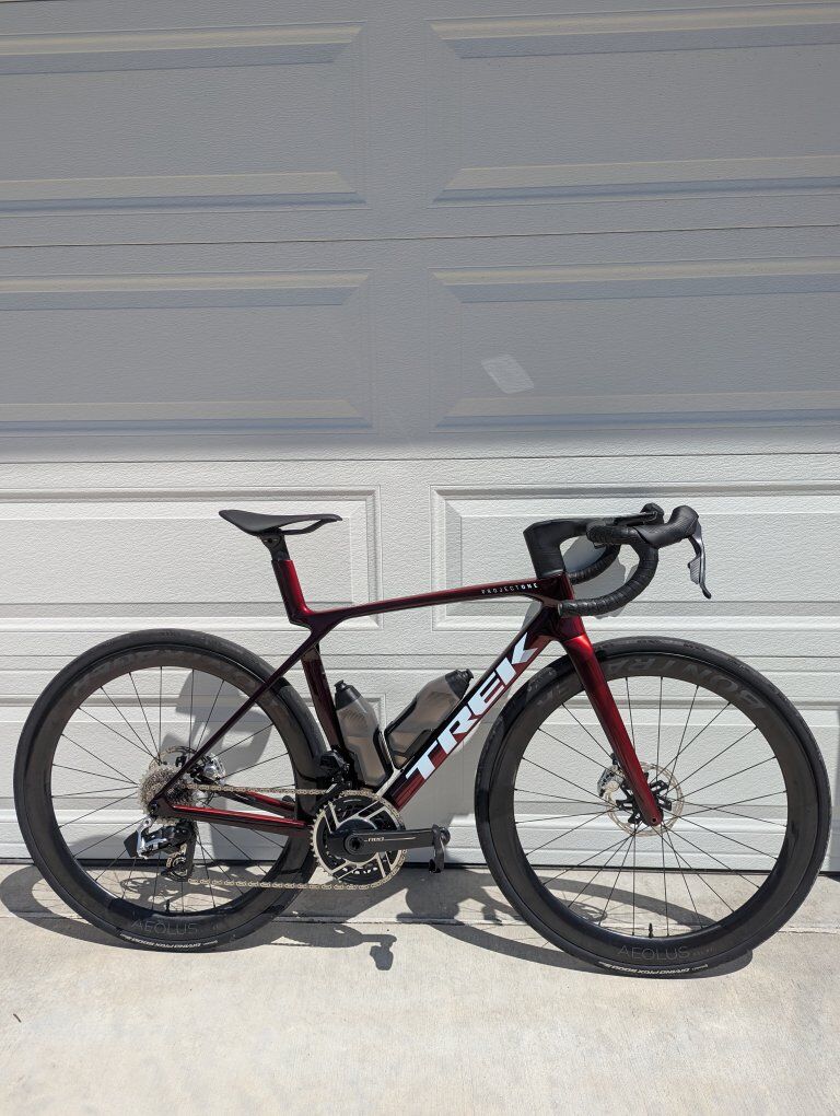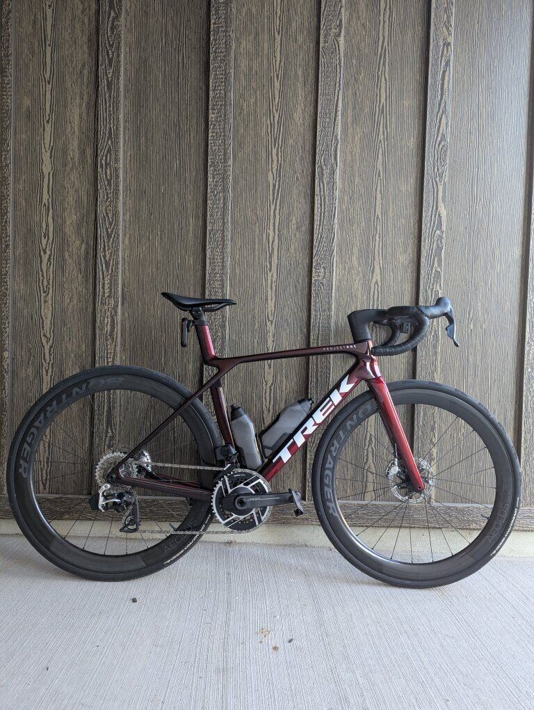 GooglePayComes stock besides tires. 701 miles. No blemishes. Fast as heck. buying a smaller size. Red AXS Aero bottles and cages RSL aero bar RSL Aeolus 51mm wheels Computer mount RSL Aeolus saddle Conti GP5000 tubeless 32mm tires installed. Weighs roughly 16lbs https://www.trekbikes.com/us/en_US/bikes/road-bikes/performance-road-bikes/madone/f/F213/madone-slr-9-axs-gen-8/46151/5319499