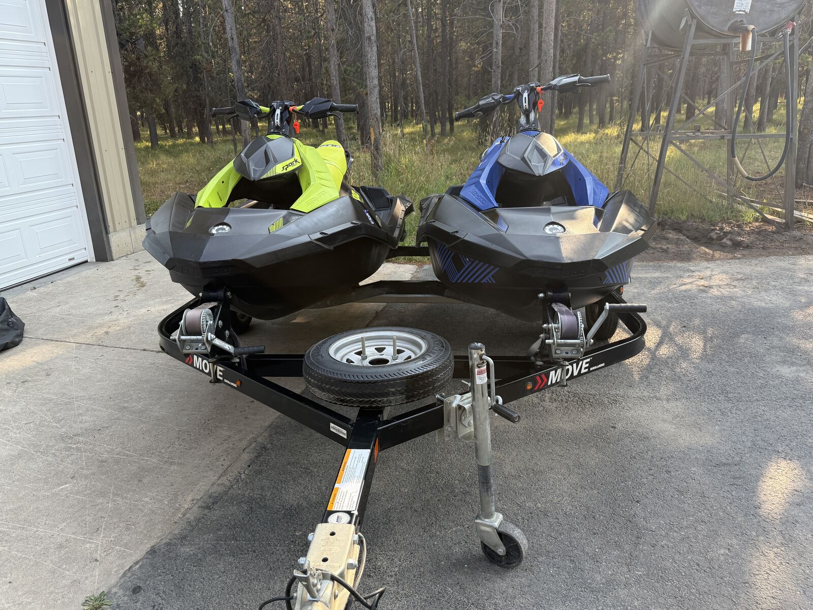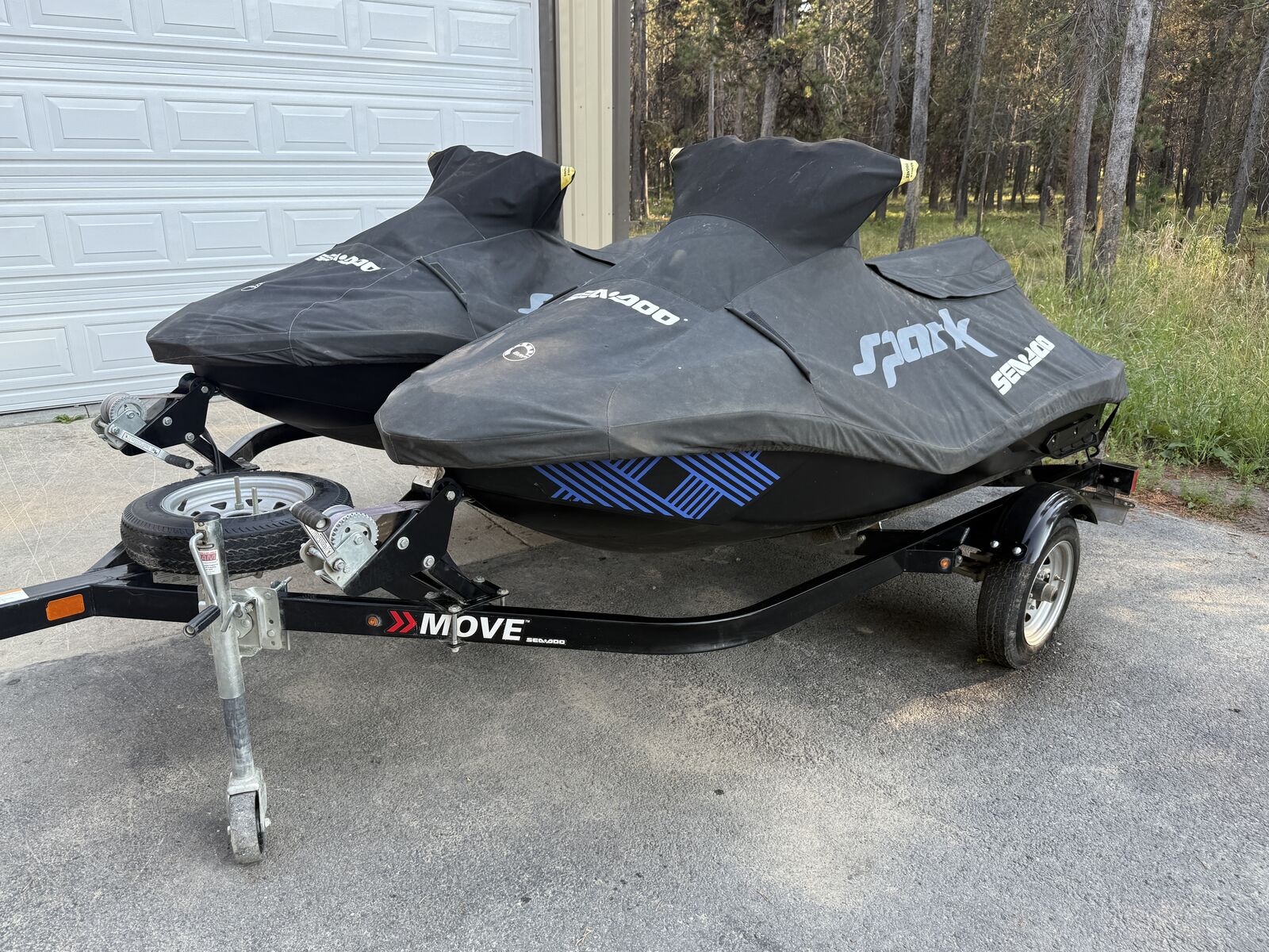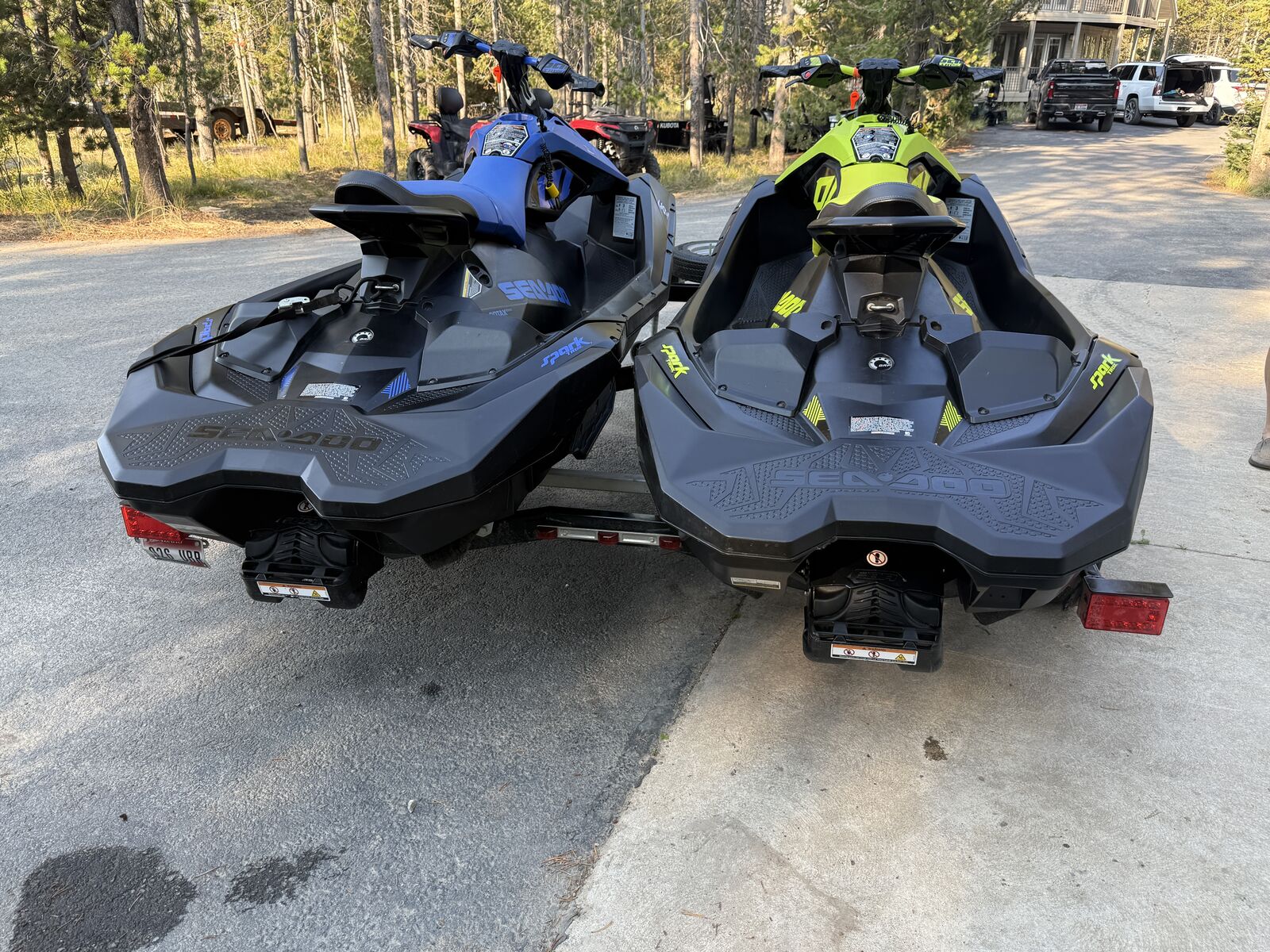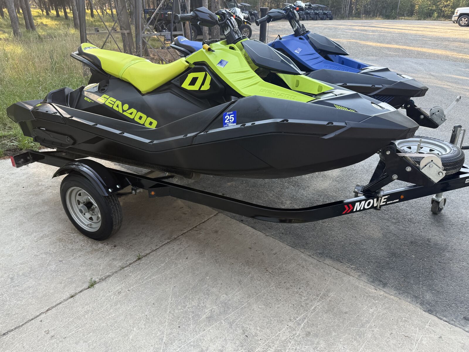 2 - 2023 Seadoo Spark Trixx 3 Ups with Karavan Move 2 trailer. Really fun machines and great for all types of riders. Both have VTS (variable trim system), IBR (Intelligent Brake and Reverse, a Rotax 900 Ace engine, and a fitted cover to protect it when not in use. Green one has 204 hours and blue one has 229 hours. Selling because we ordered newer models. NO TRADES, cash only, title in hand