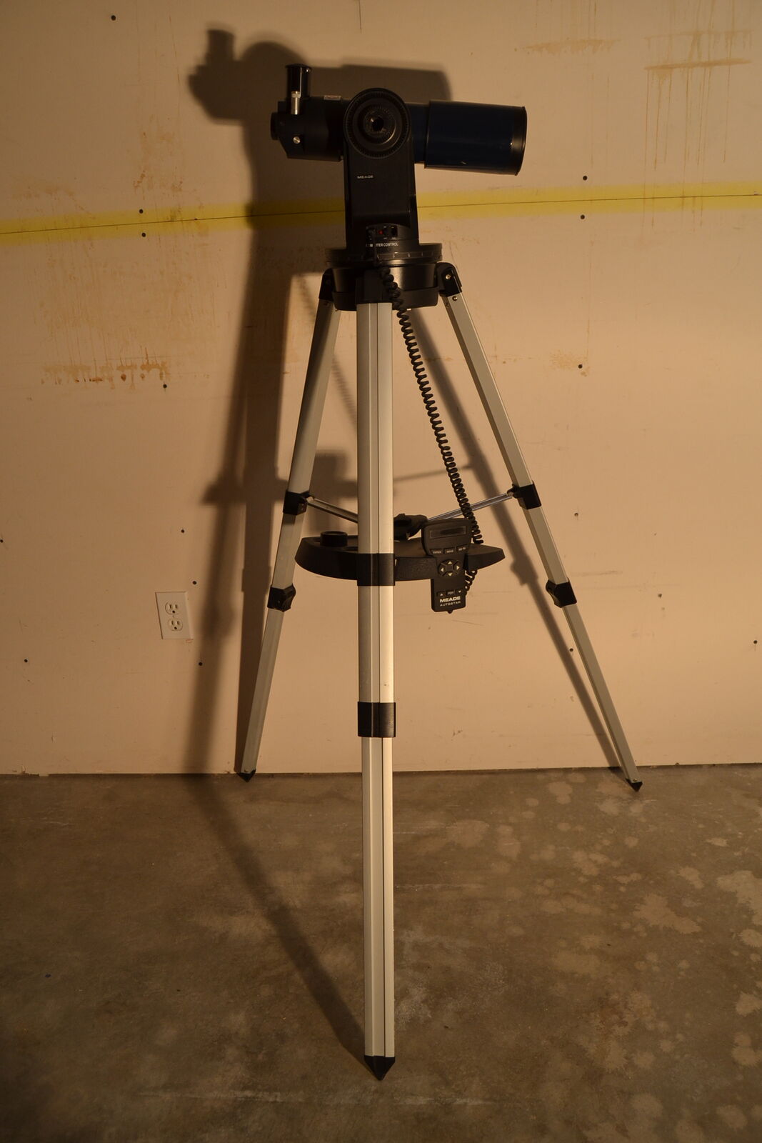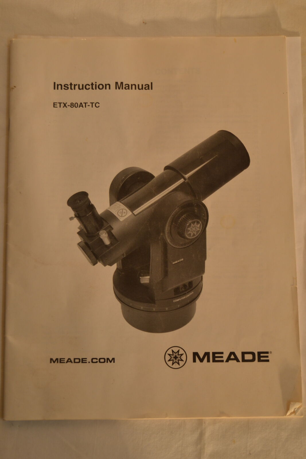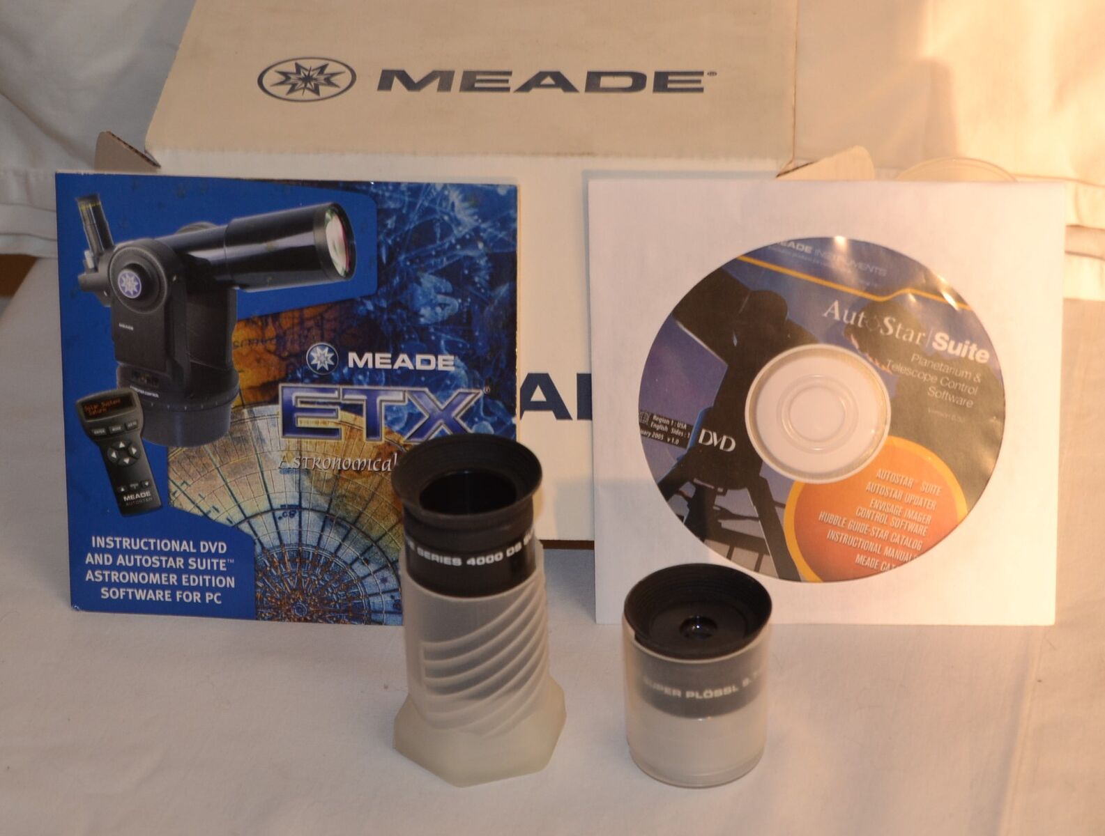 Mead ETX 80 with auto star. includes star chart book, computer interface software, with cables. has carrying bag for tri pod. AutoStar feature makes it easy to find planets and stars (will need to be set up for location) or can just manualy point and view.