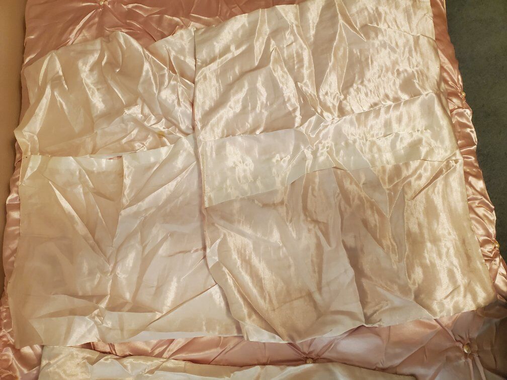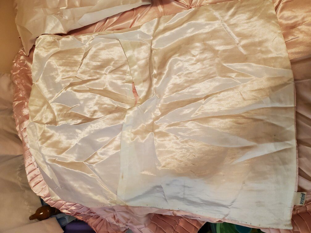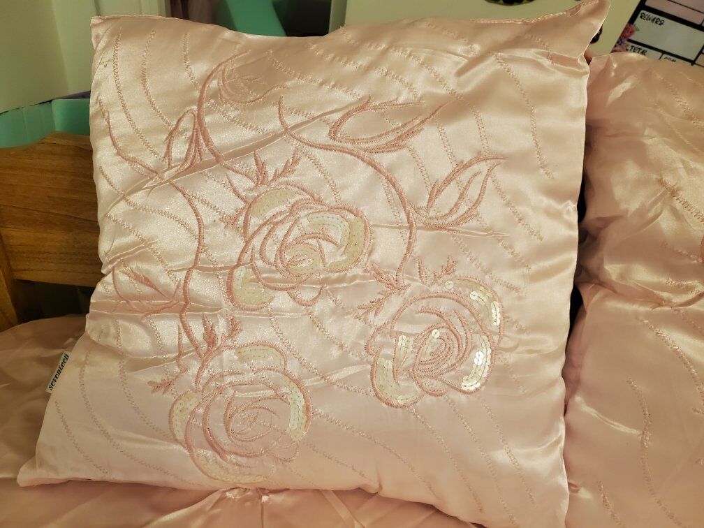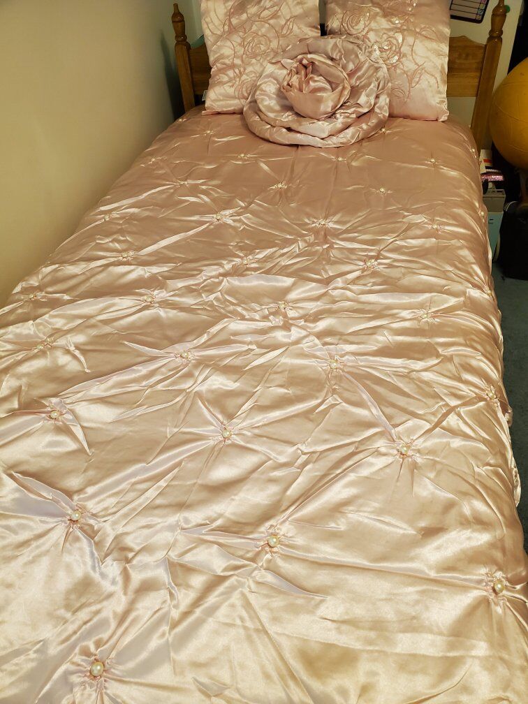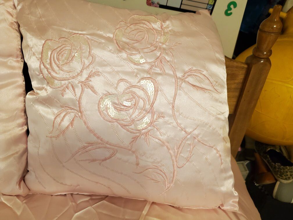 Twin size satin bed spread light pink with pearls comes with 3 pillow shams and 3 throw pillows. good condition one of the pillow shams is missing a few peals see pictures there are a couple stains See pictures and one of the throw pillows need to be sewed see pictures offers welcome