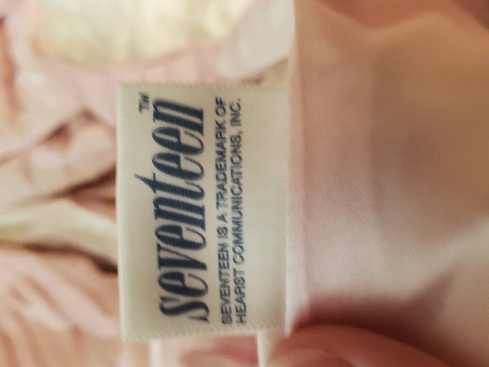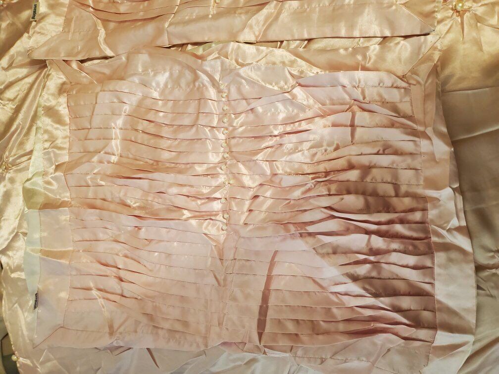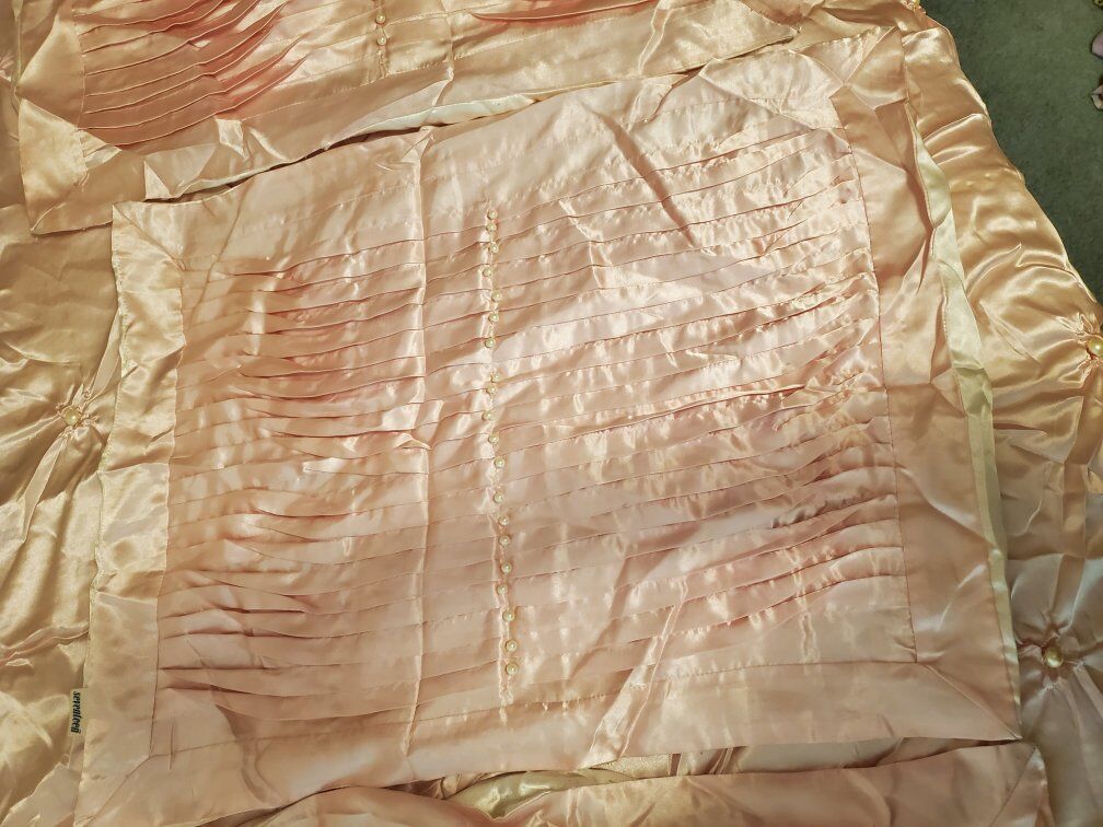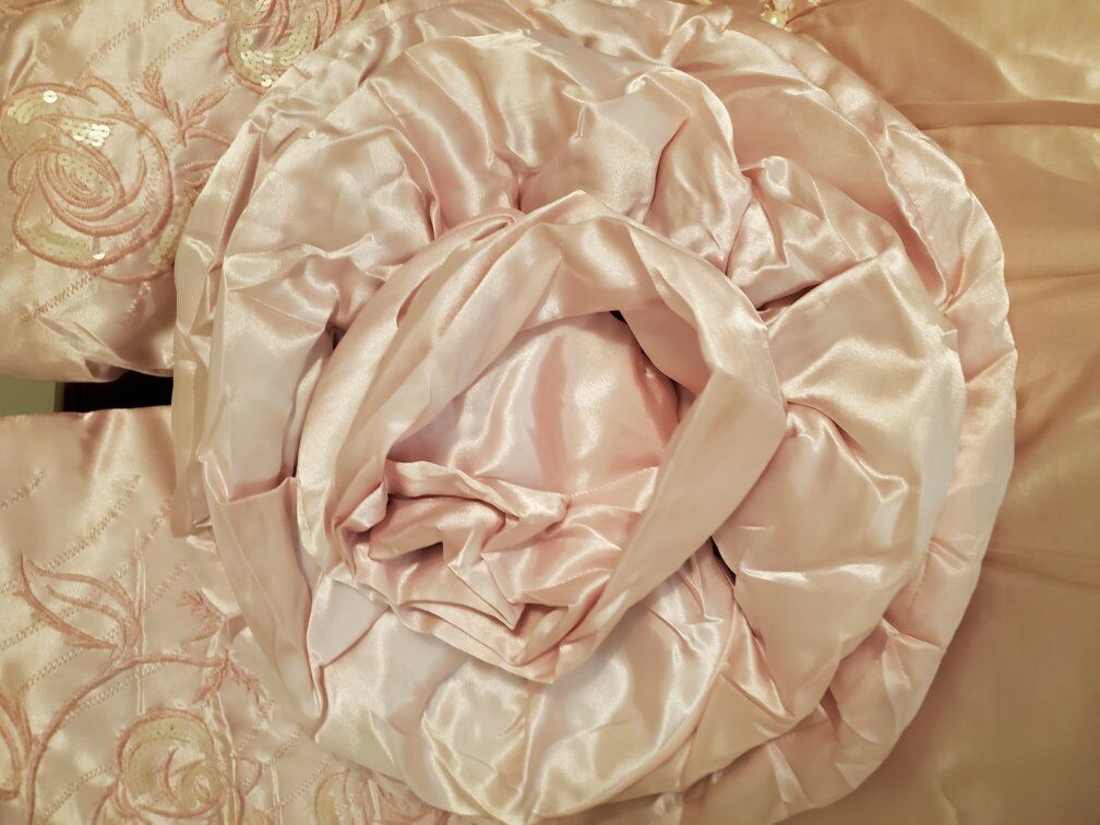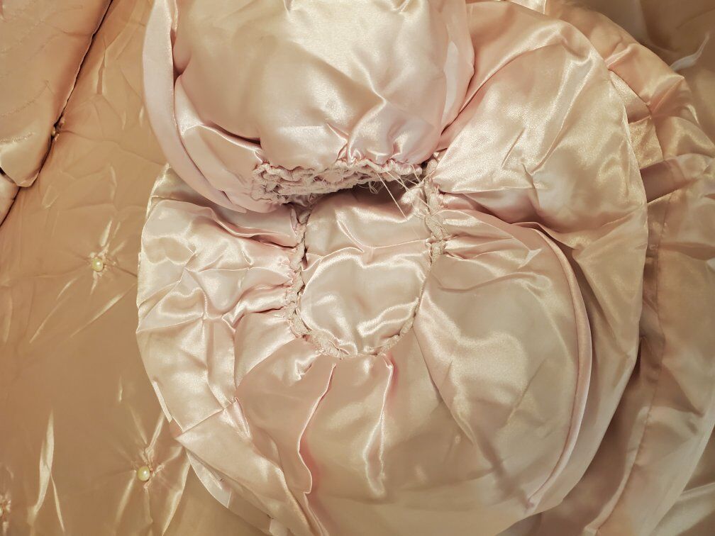 Twin size satin bed spread light pink with pearls comes with 3 pillow shams and 3 throw pillows. good condition one of the pillow shams is missing a few peals see pictures there are a couple stains See pictures and one of the throw pillows need to be sewed see pictures offers welcome