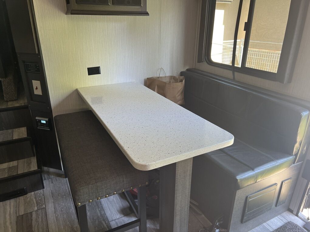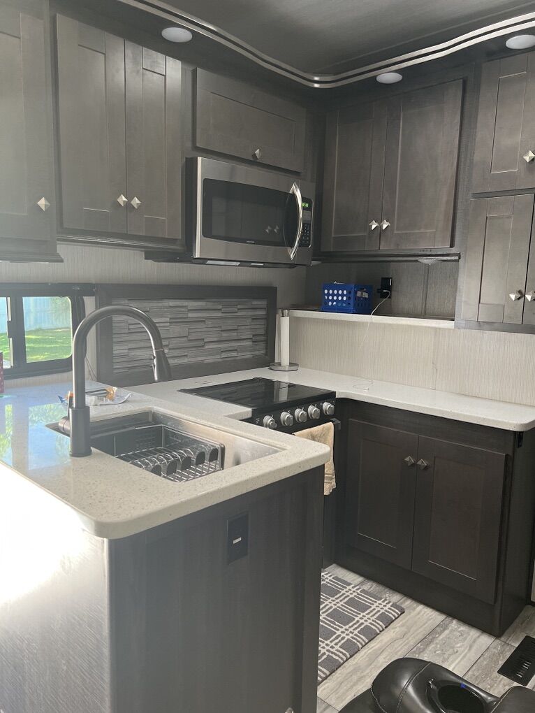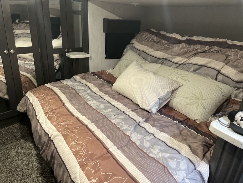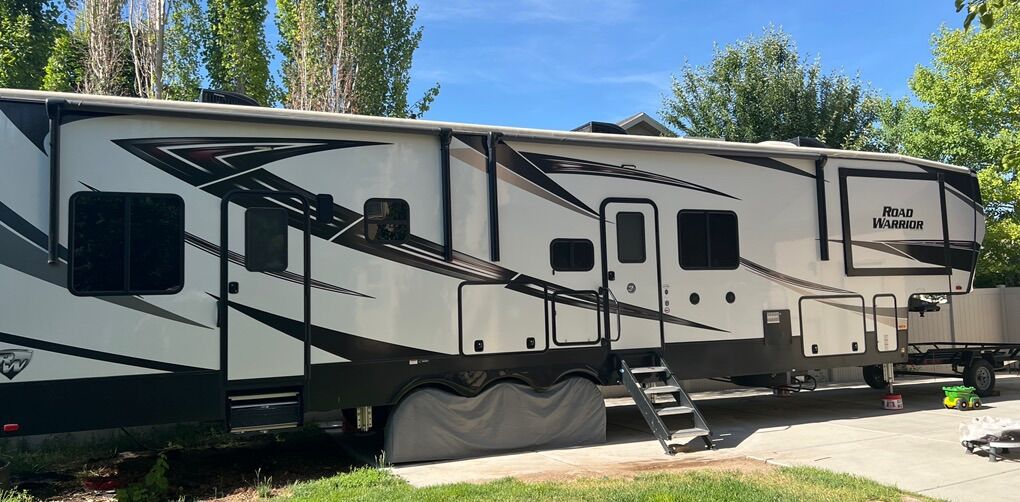 Venmo2021 Road Warrior 414rw 5th Wheel Toy hauler w/auto level system and 3 AC units. $600 per day 5 day minimum. $500 delivery fee within Utah. Sleeps 2-7. Comes with 2 awnings and LED lights. 2 recliners/couch, king size bed, dinette, full size residential fridge. Solar panels and generator on board. 13 foot Garage for recreational toys. Garage has queen size drop down bed and bed/split couch seat and a single bunk bed. Starlink internet (if needed) Fully furnished trailer:: Kitchen includes plates, bowls, cups, silverware, kitchen utensils, knives, mixing bowls, toaster, pots and pans, hand towels, wash rags, dish soap, cleaning wipes, paper towels. Bedroom includes sheets, blankets and pillows. Bathroom includes towels, handtowels and washrags. MUST BE 55+. No pets. Tax and Damage Waiver not included in rates.
