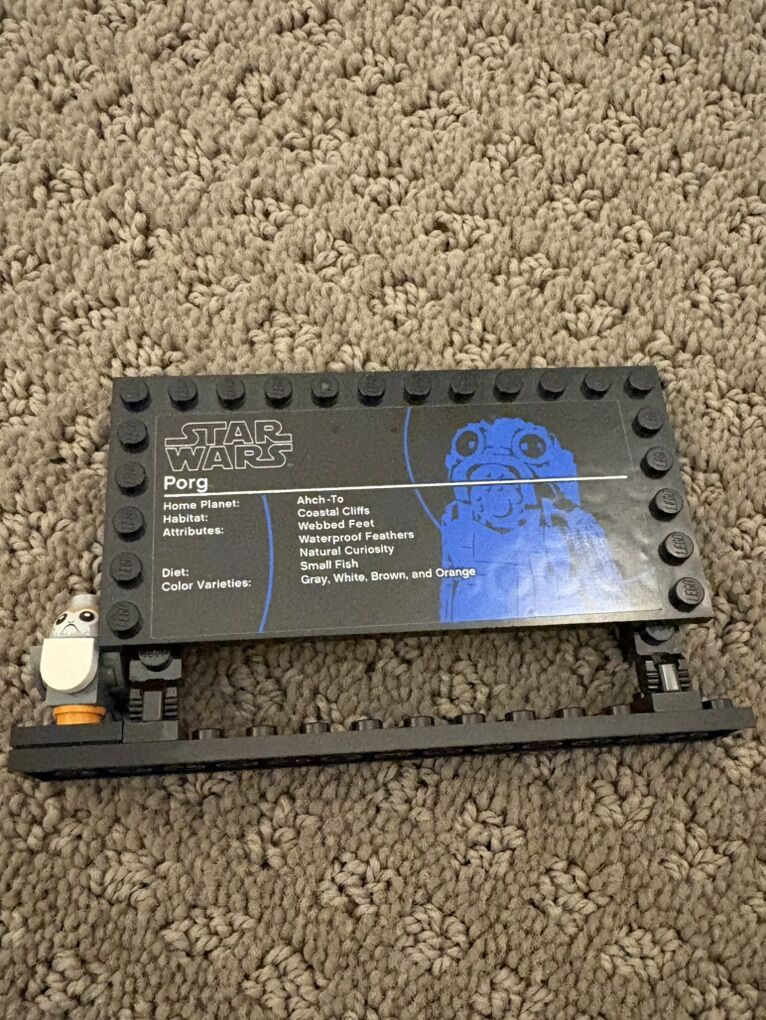 LEGO set 75230: Porg. This set was released in 2018 as part of the Last Jedi theme. It has 811 pieces and 1 Porg minifigure. It is complete and in great shape. Box, instruction book in mint condition. Comes from pet/smoke free home. Pickup, cash only. Firm on price.