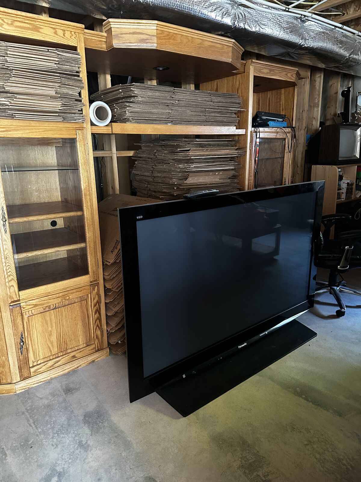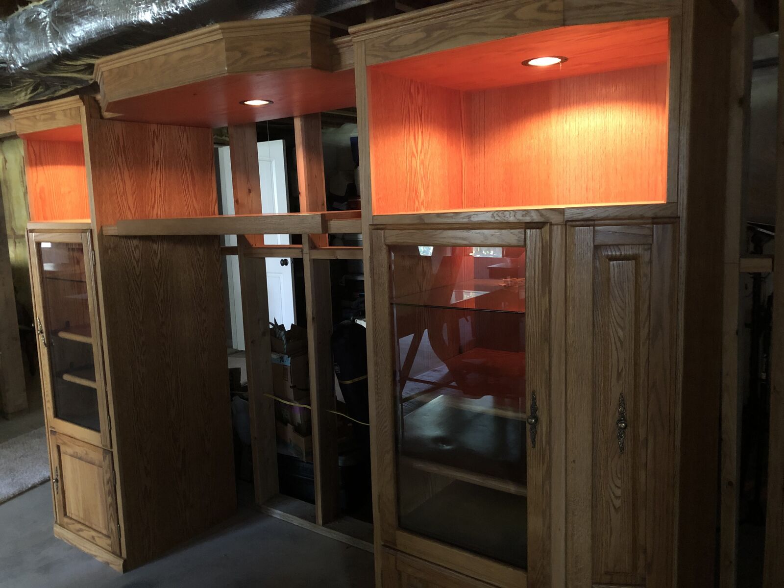VenmoPriced to sell... Entertainment units do not go out of style! This large heavy duty, solid wood, beautiful wall unit is in perfect condition. The unit shelving lights up and displays pictures and decor. The glass side cabinets have shelves for a blue ray player or speakers. It also displays more pictures & books or decor. The cupboards below hide electronic storage. Each side of the unit slides out for DVD, CD, or book storage. The center surrounds and displays any size flatscreen TV because the unit is adjustable, 6' to 7" wide, 6'3" tall. You will need a TV stand.