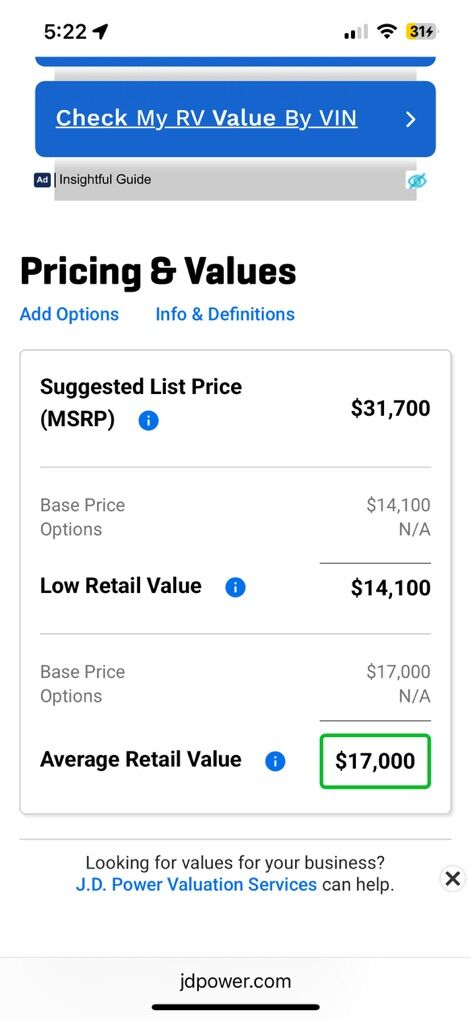 JD power values at $17k (average) and $14k (low). (See pictures of JD Power estimate)