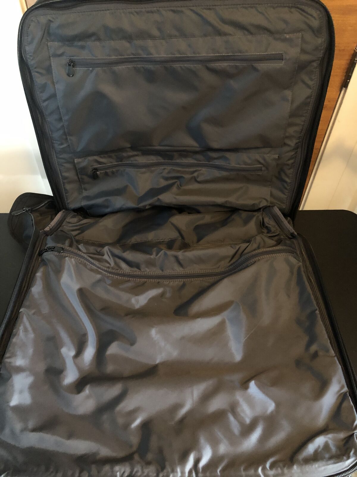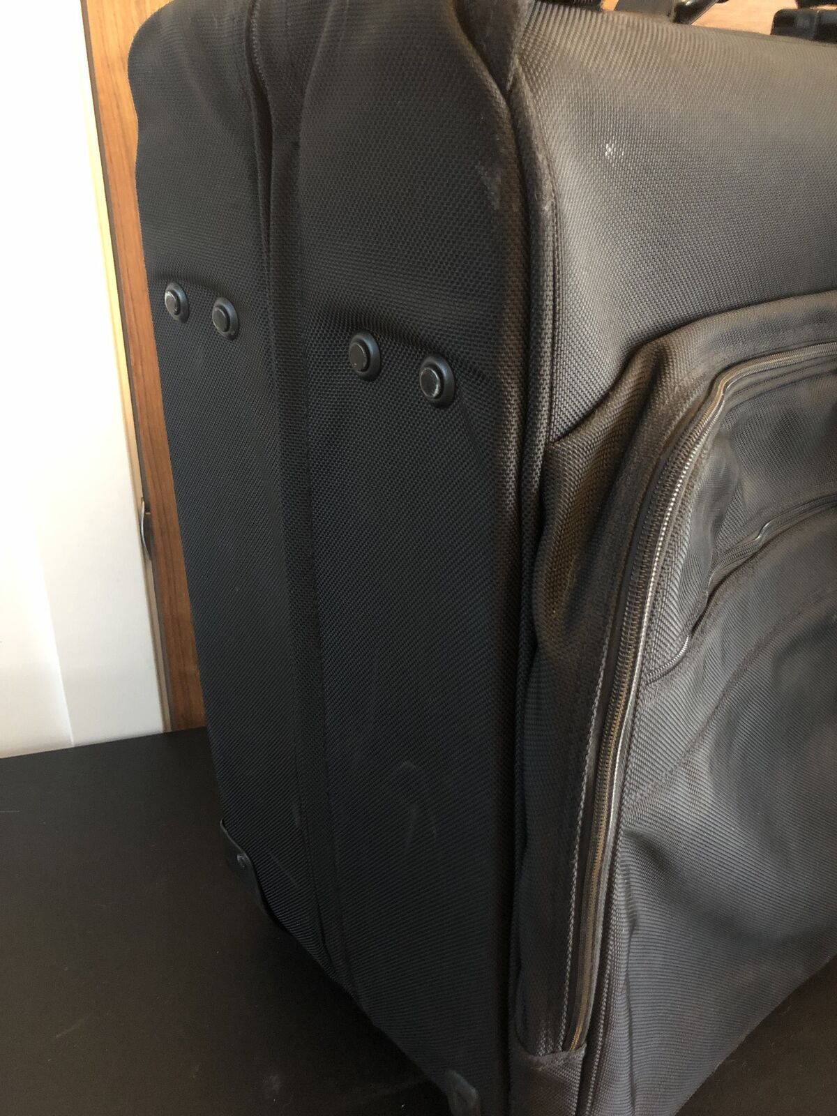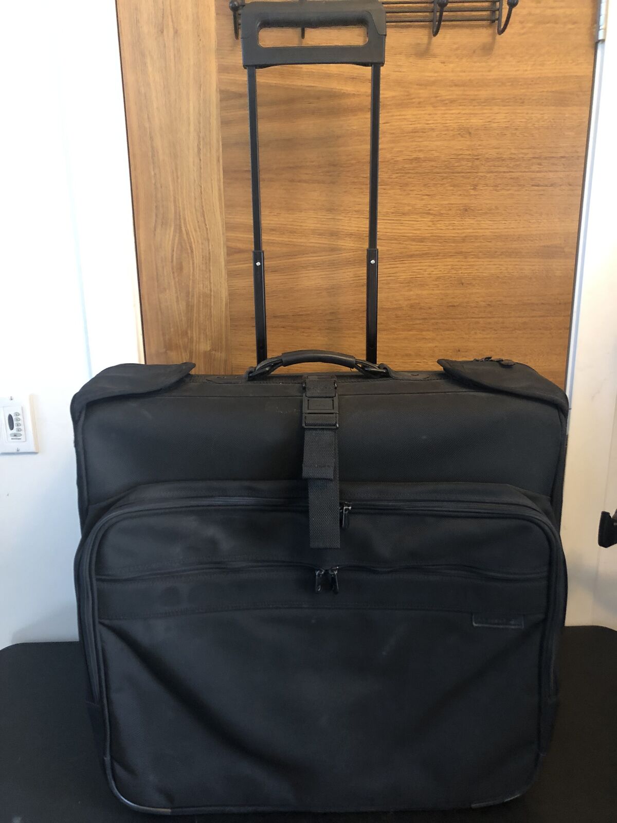 Black Color X-Large 2 Wheel Model 04-U78. Clean No Rips Holes or Tears. All zippers, wheels and retractable handle work with no issues. Handle has some wear (as shown). Includes Smart Link Strap. There is a very large detachable sleeve with many compartments on both sides (as shown in yellow). Garment Hook Included. Approximately 24” T x 25” W x 11” D.