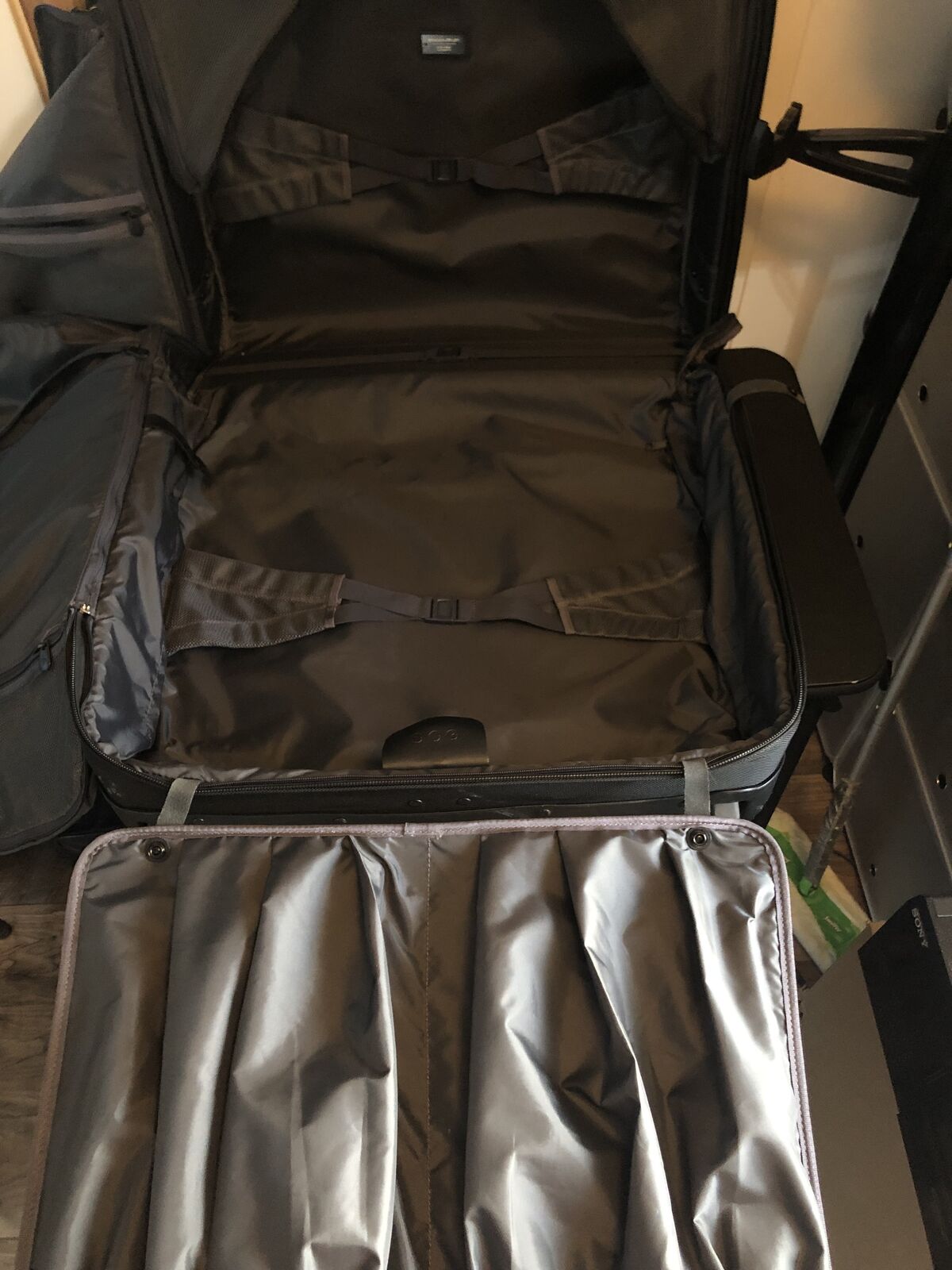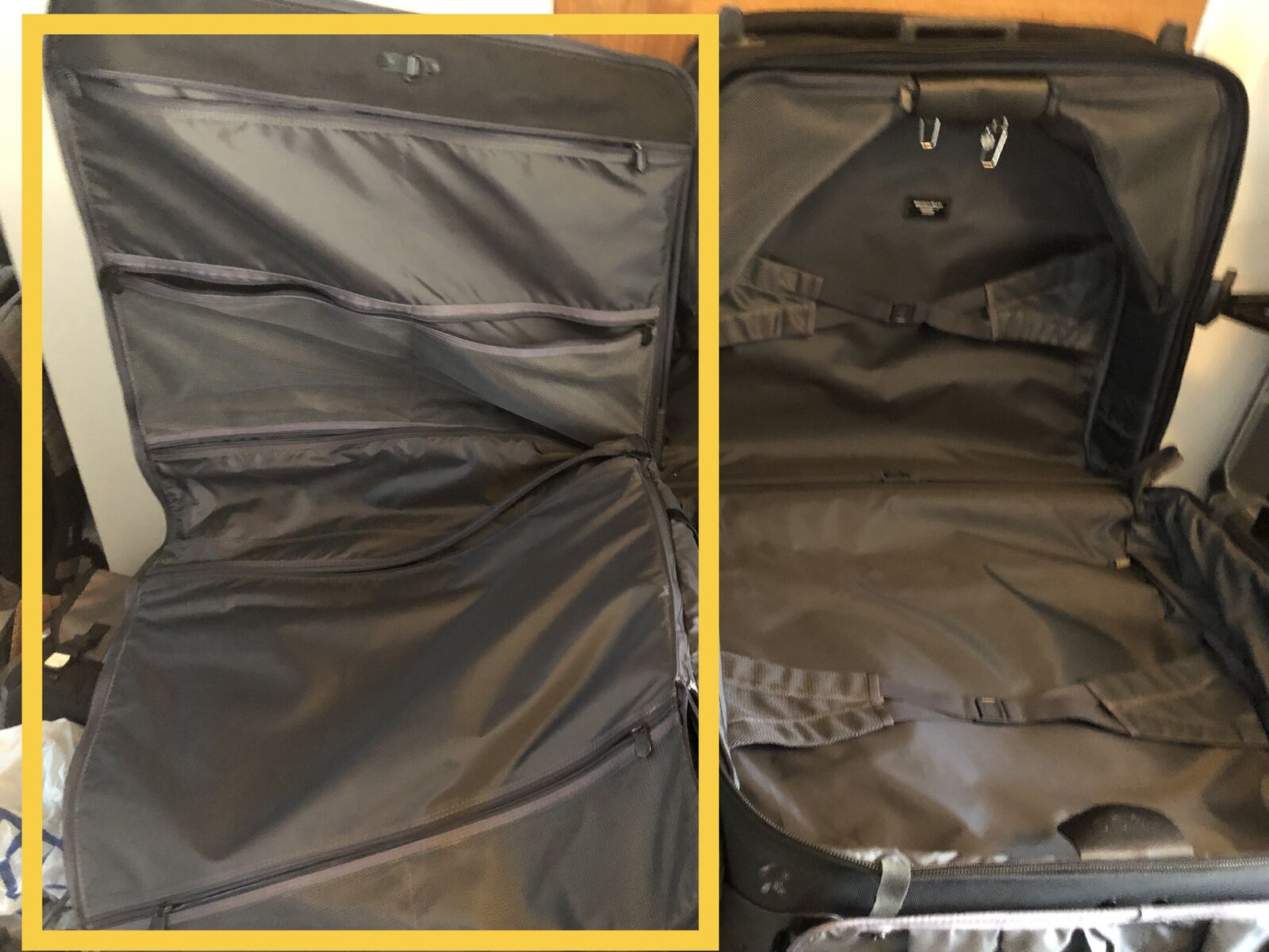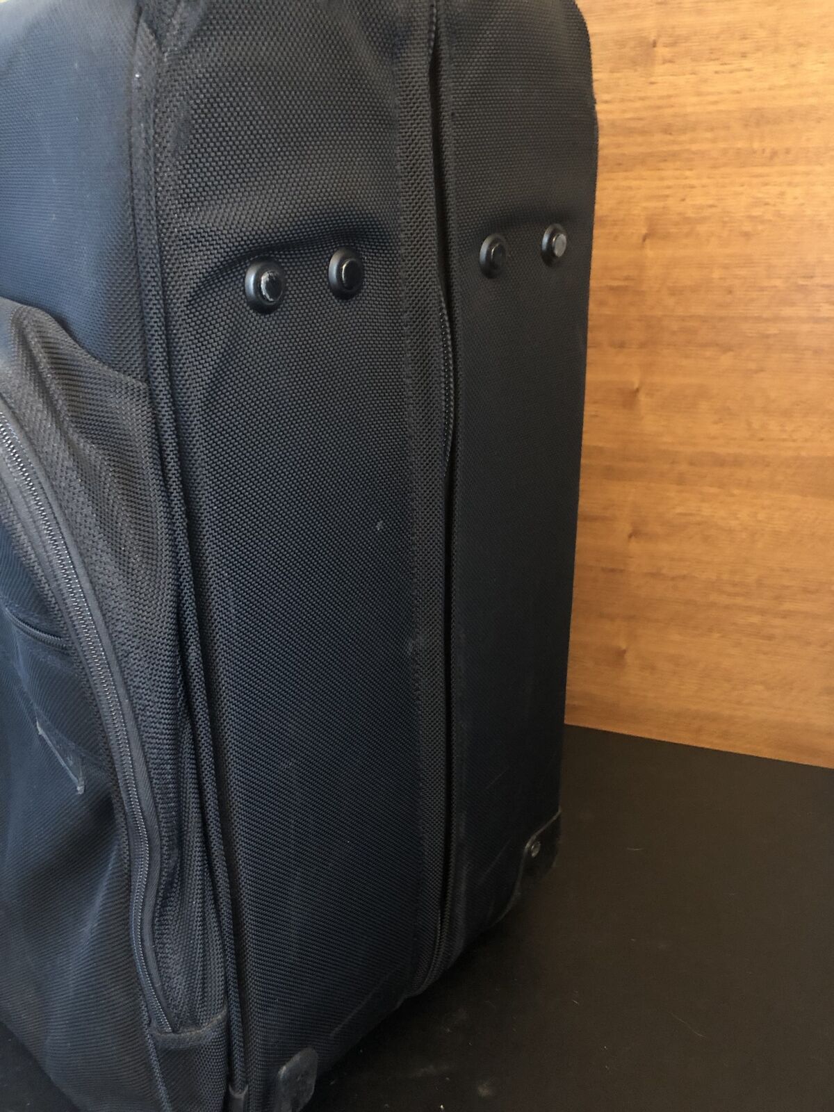 Black Color X-Large 2 Wheel Model 04-U78. Clean No Rips Holes or Tears. All zippers, wheels and retractable handle work with no issues. Handle has some wear (as shown). Includes Smart Link Strap. There is a very large detachable sleeve with many compartments on both sides (as shown in yellow). Garment Hook Included. Approximately 24” T x 25” W x 11” D.