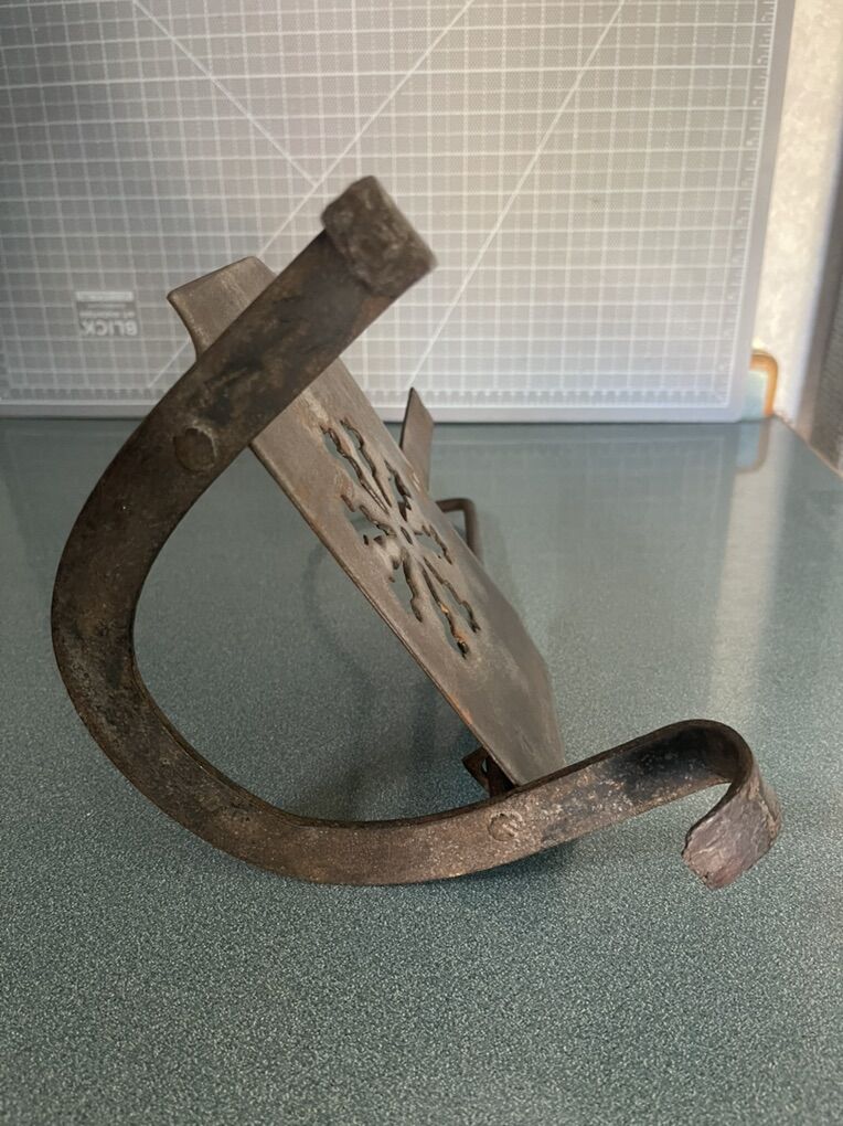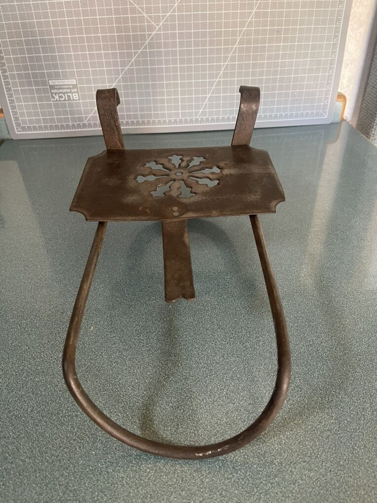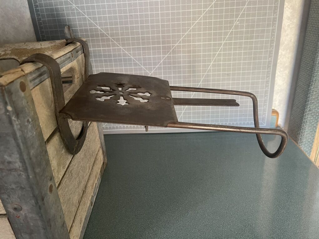 Wrought iron “trivet toaster” was hung on a bar in the hearth and one could heat a pan food, a kettle or even a sad iron.