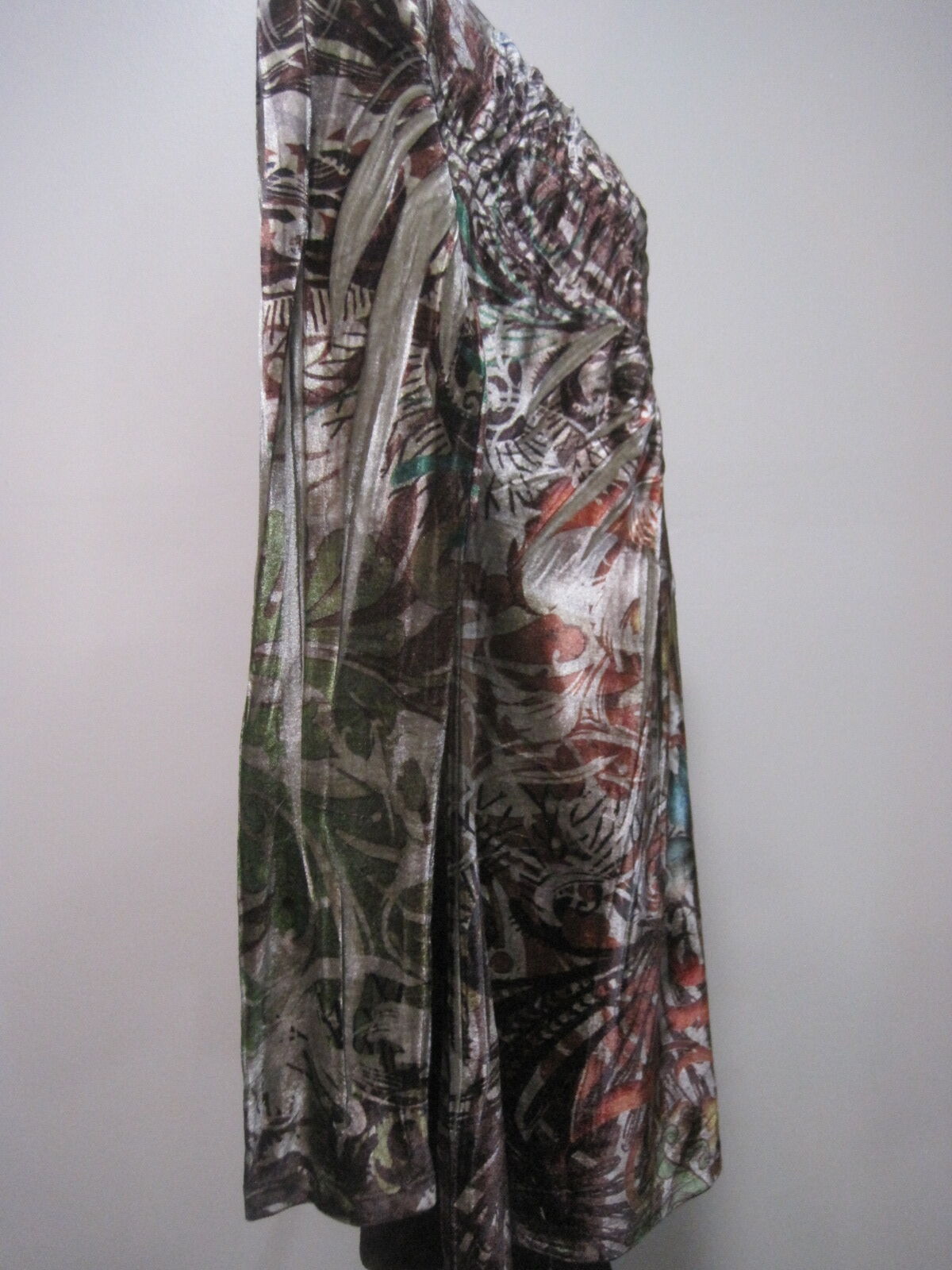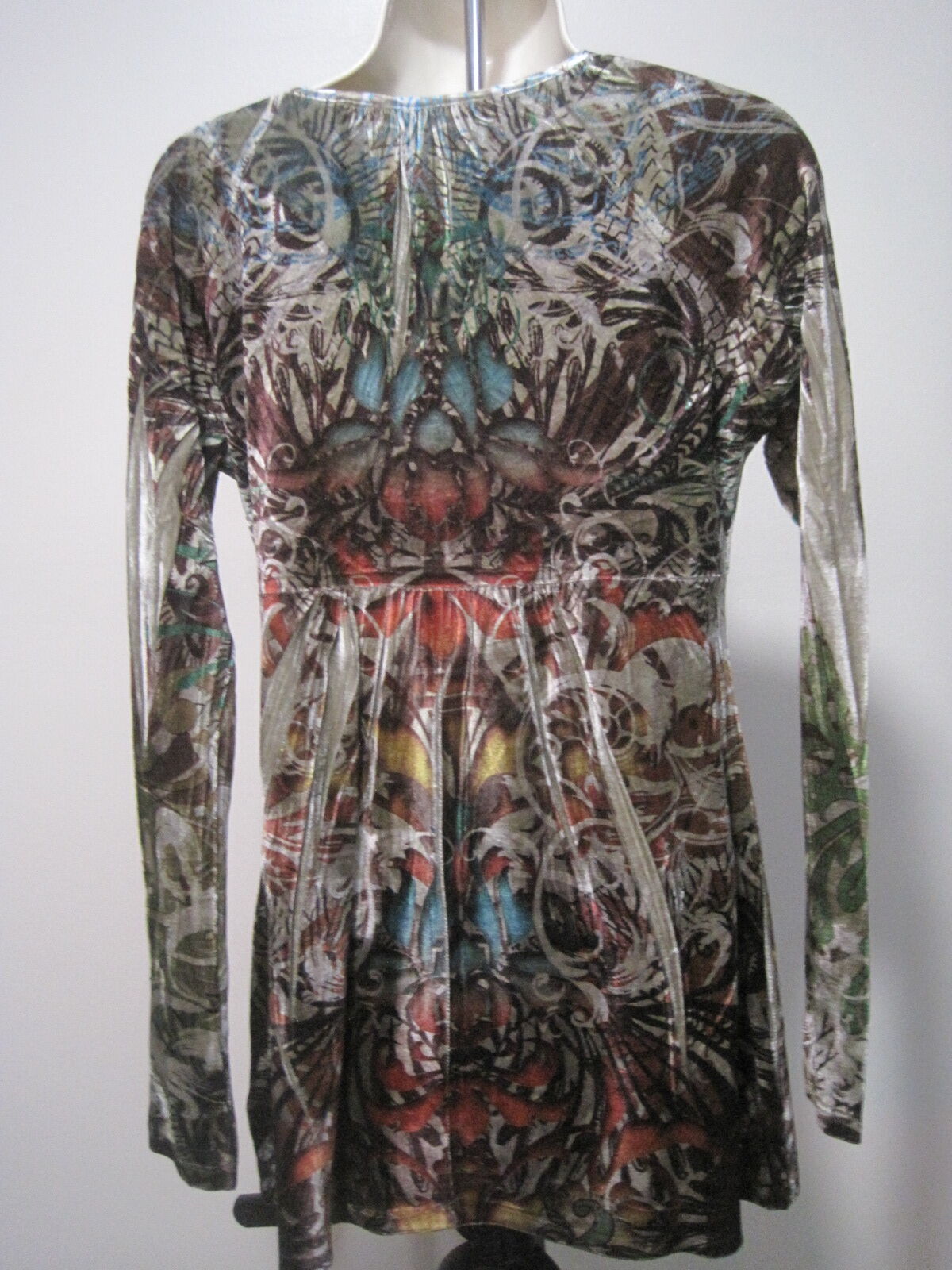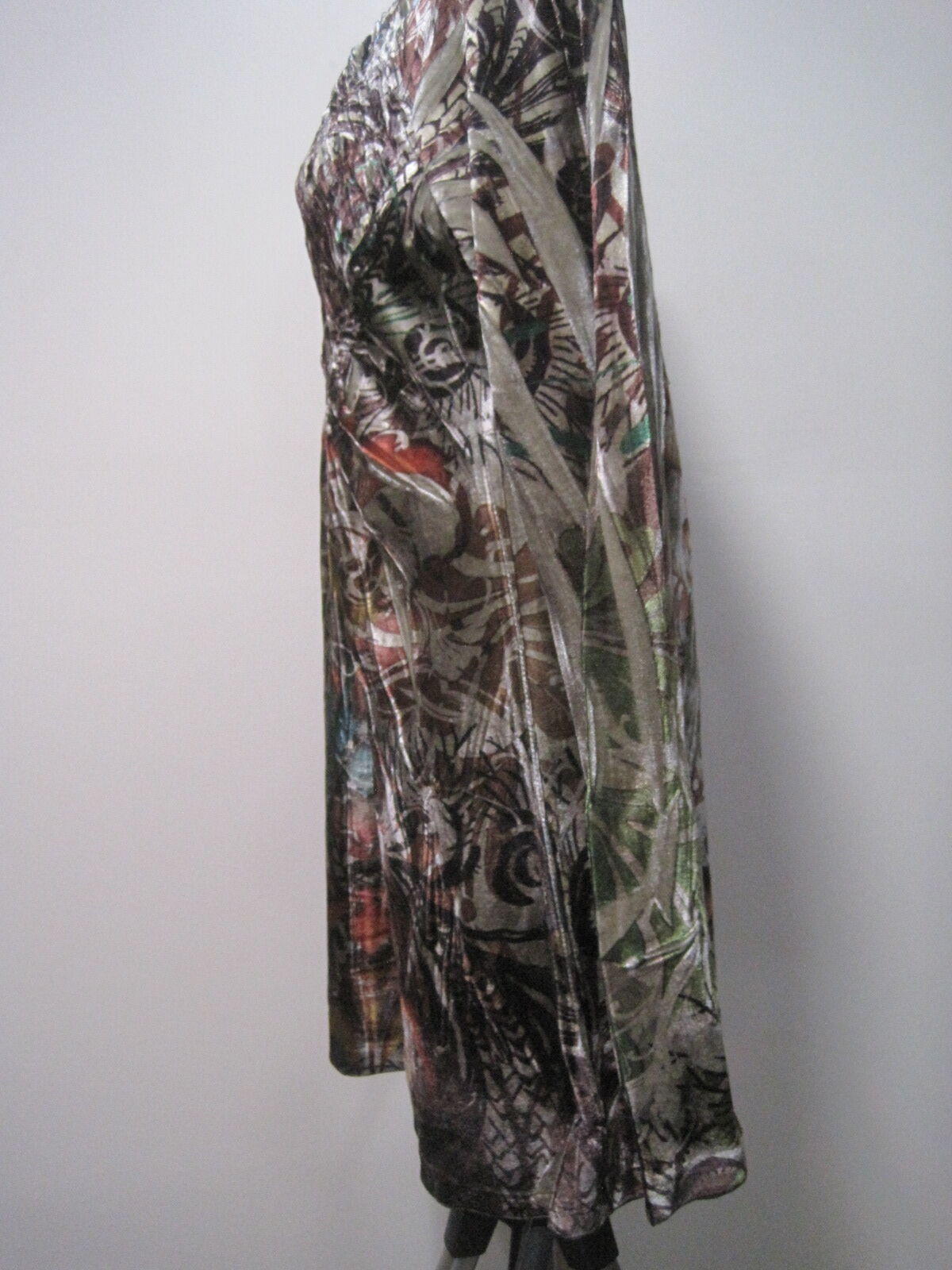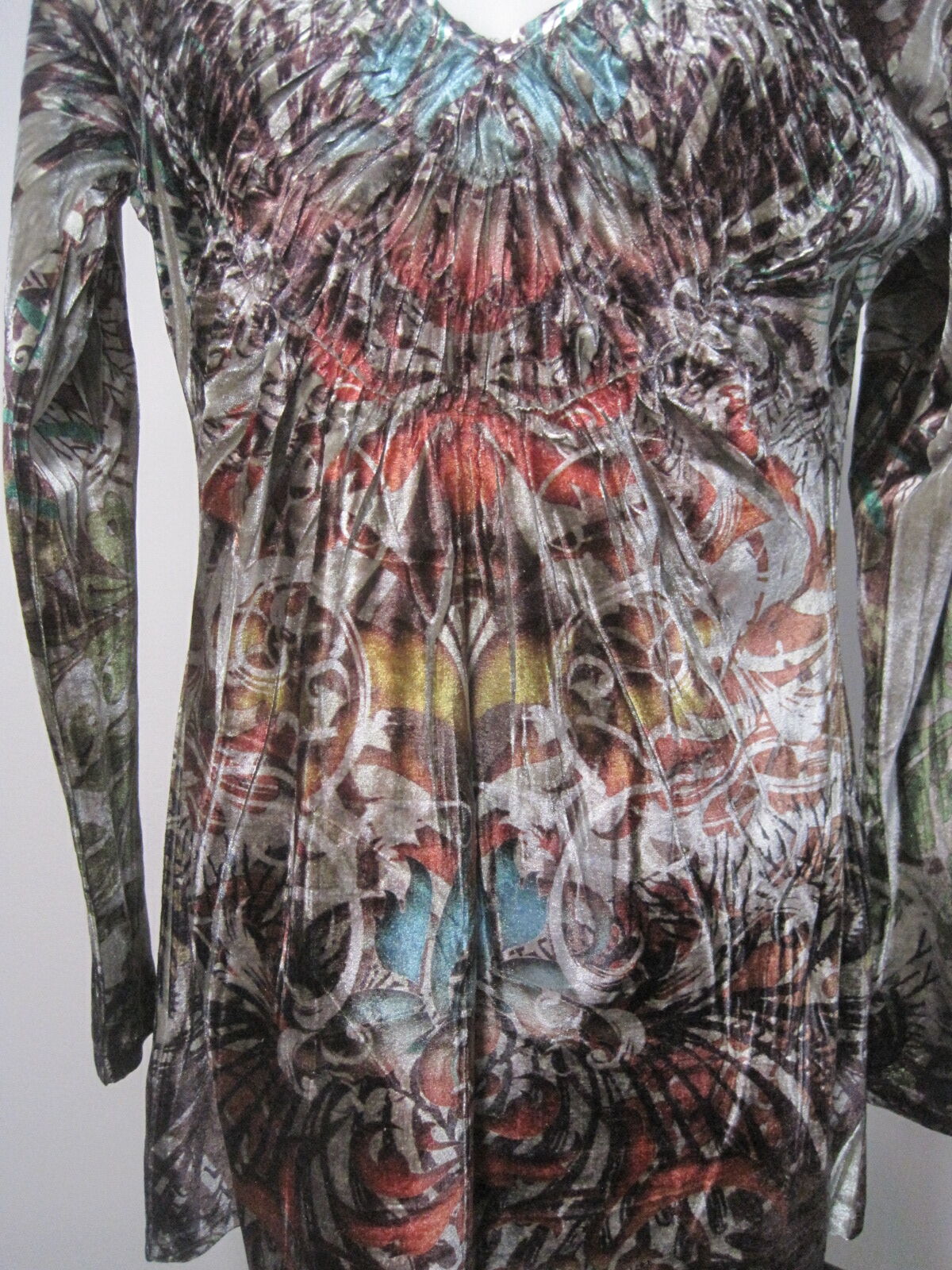 This Vintage One World Velvet Polyester Long Sleeve Colorful Tunic Top in Women's Medium features a V-neckline and a pullover closure. The tunic top is perfect for various occasions such as travel, parties, or casual wear. Made from velvet fabric with a paisley pattern and crochet accents, this top is adorned with colorful hues and a bohemian theme. The long sleeves and stretch fabric make it comfortable for the winter, fall, and spring seasons. With its hippie and nature-inspired design, this tunic top is a stylish addition to any woman's wardrobe.