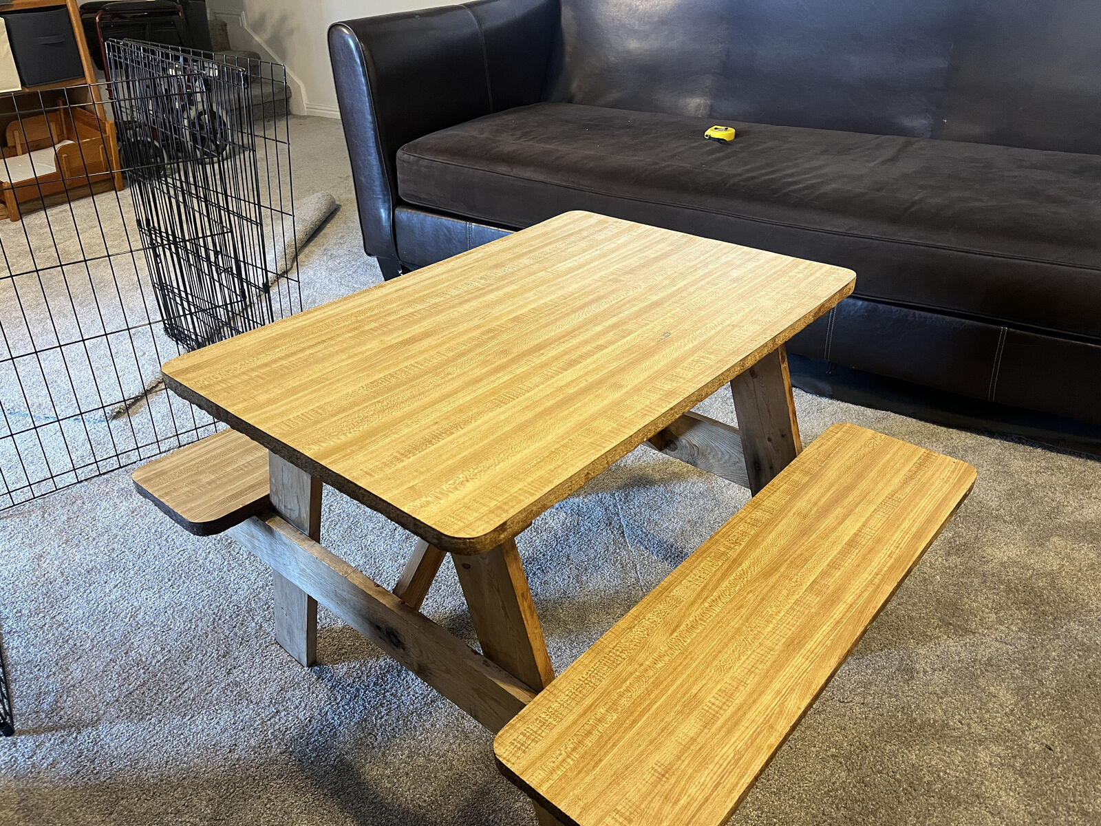 ApplePayFun child picnic table. Solid, still used. Particle board. Has had water damage underneath in the past. Has been treated and varathaned. Top of table is 30 x 20 x 22 inches. Seats are 29 x 8 x 13 inches. $30 cash only. You haul away. Text Kim if interested. 801-739-5977