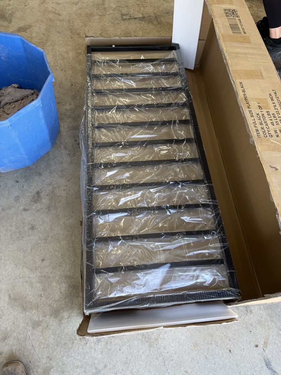 VenmoI have 1 new large kids play pen. Black in color. And it’s metal. Never opened and still in the box. Dimensions are 21.5 inches tall by 56 inches wide by 77 inches long