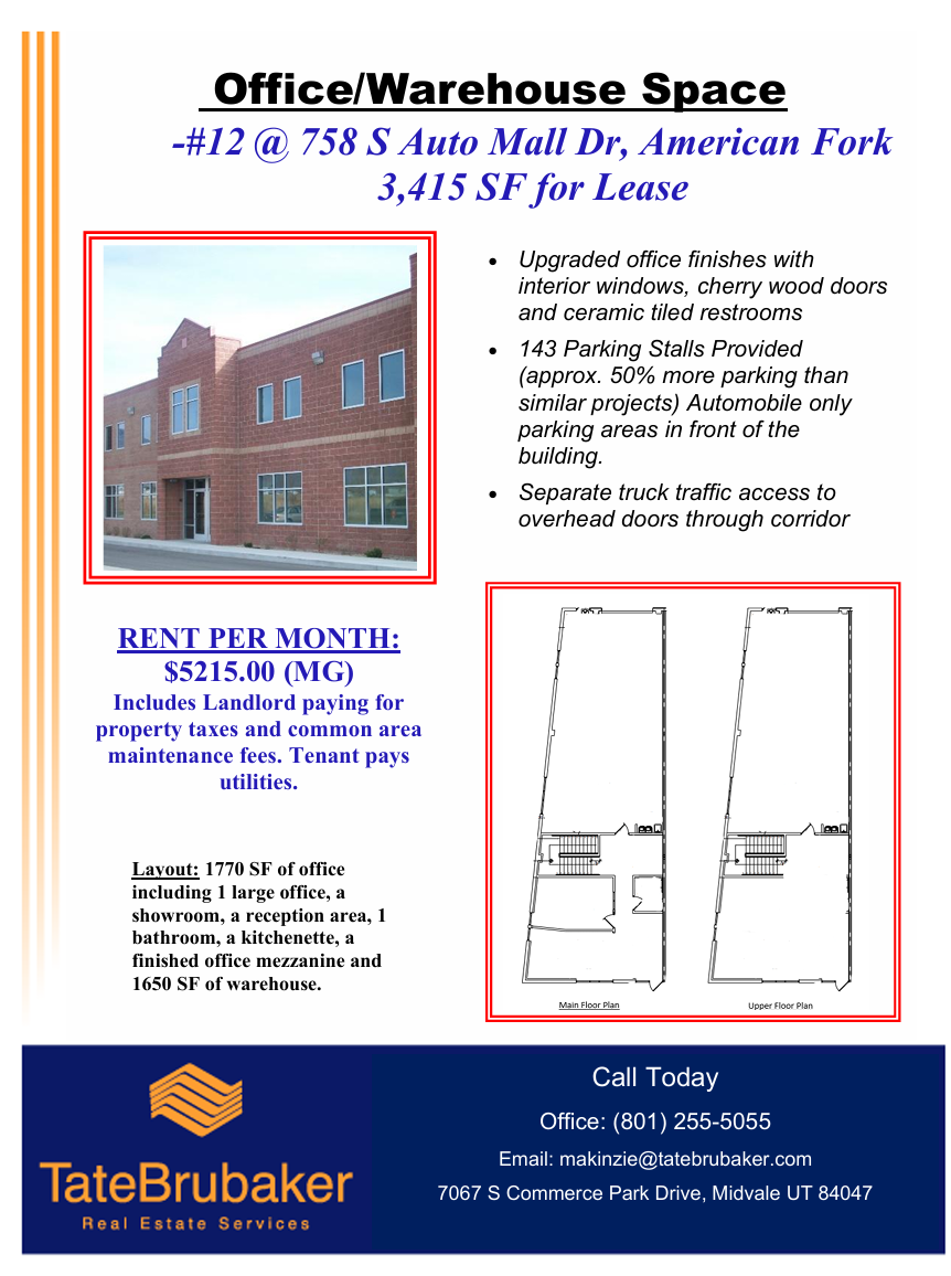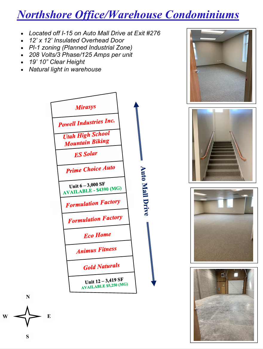 3415 SF of high-quality flex space available February 1st. This unit is an end unit with tons of natural light, a 1700 SF open office concept that suites a showroom very well, a private restroom, and 1650 SF warehouse space that is heated with lights and outlets, a 12' x 12' overhead garage door, and 19' 10" inches of clear height for max storage. The price is $5215 per month modified gross meaning tenant pays utilities in addition but Landlord covers property taxes, maintenance fees, sewer, and trash. Call today to schedule a showing.