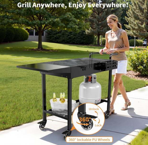 ZellePortable Grill Table - Featuring a pre-assembled foldable frame, this BBQ table expands in 20 seconds with 360° lockable wheels. The compact design fits in car trunks effortlessly, making it ideal for outdoor grilling and camping trips.