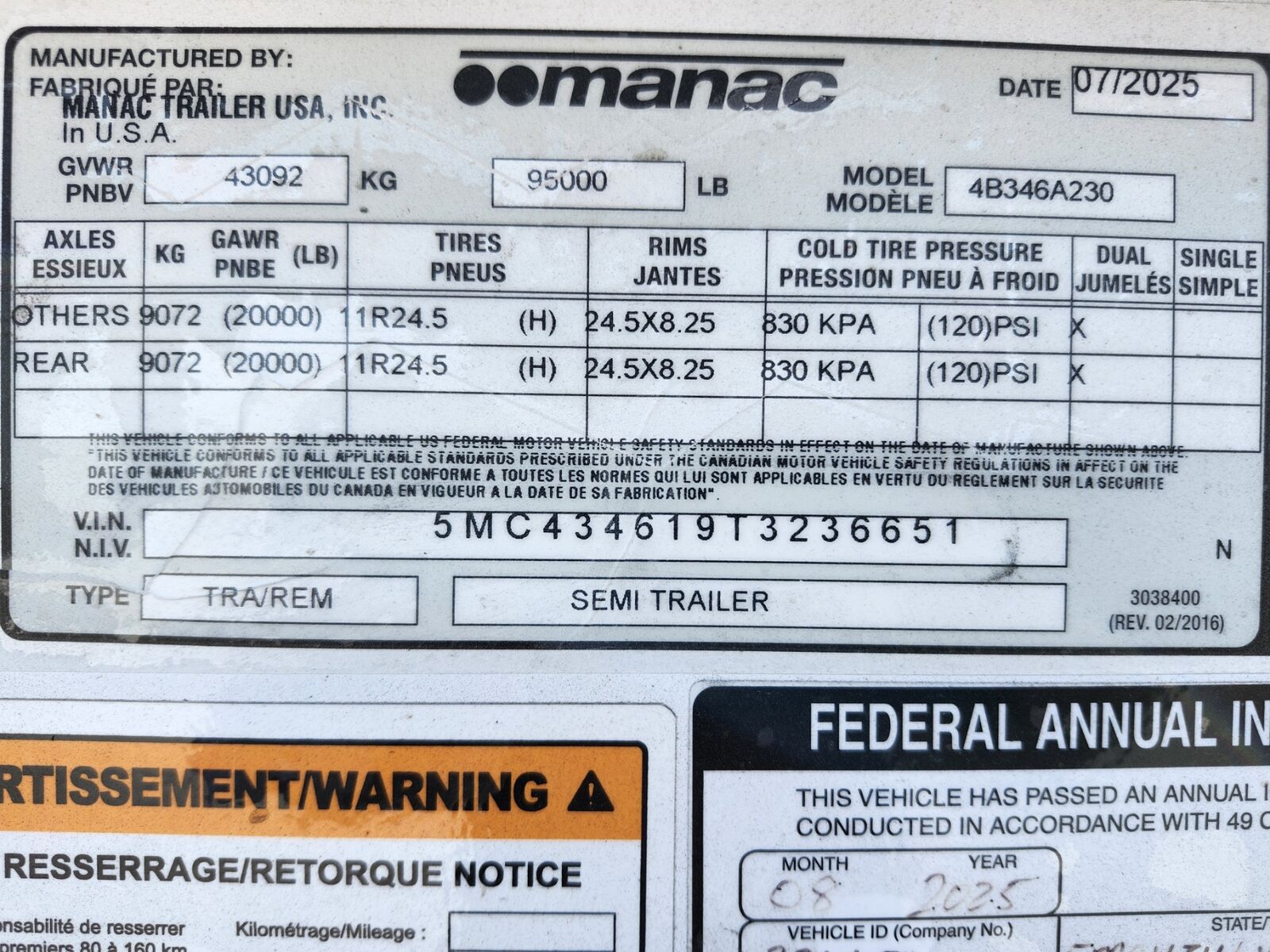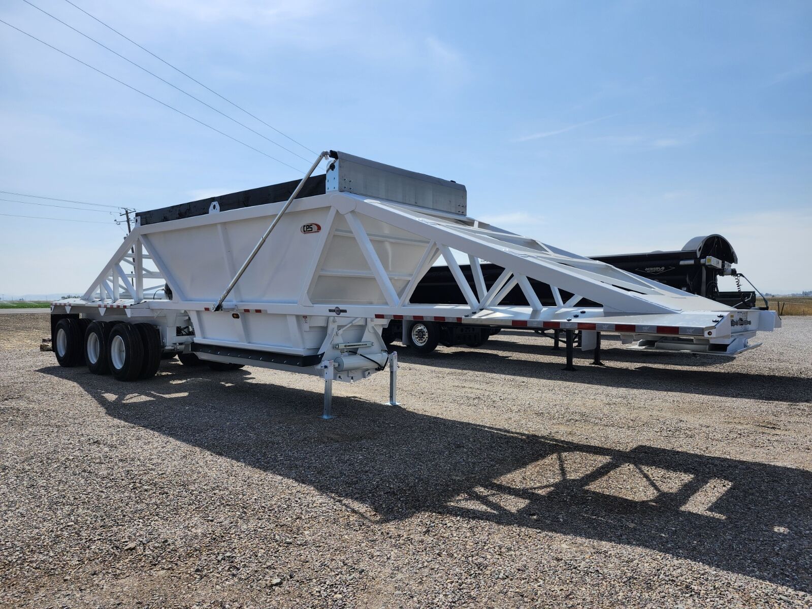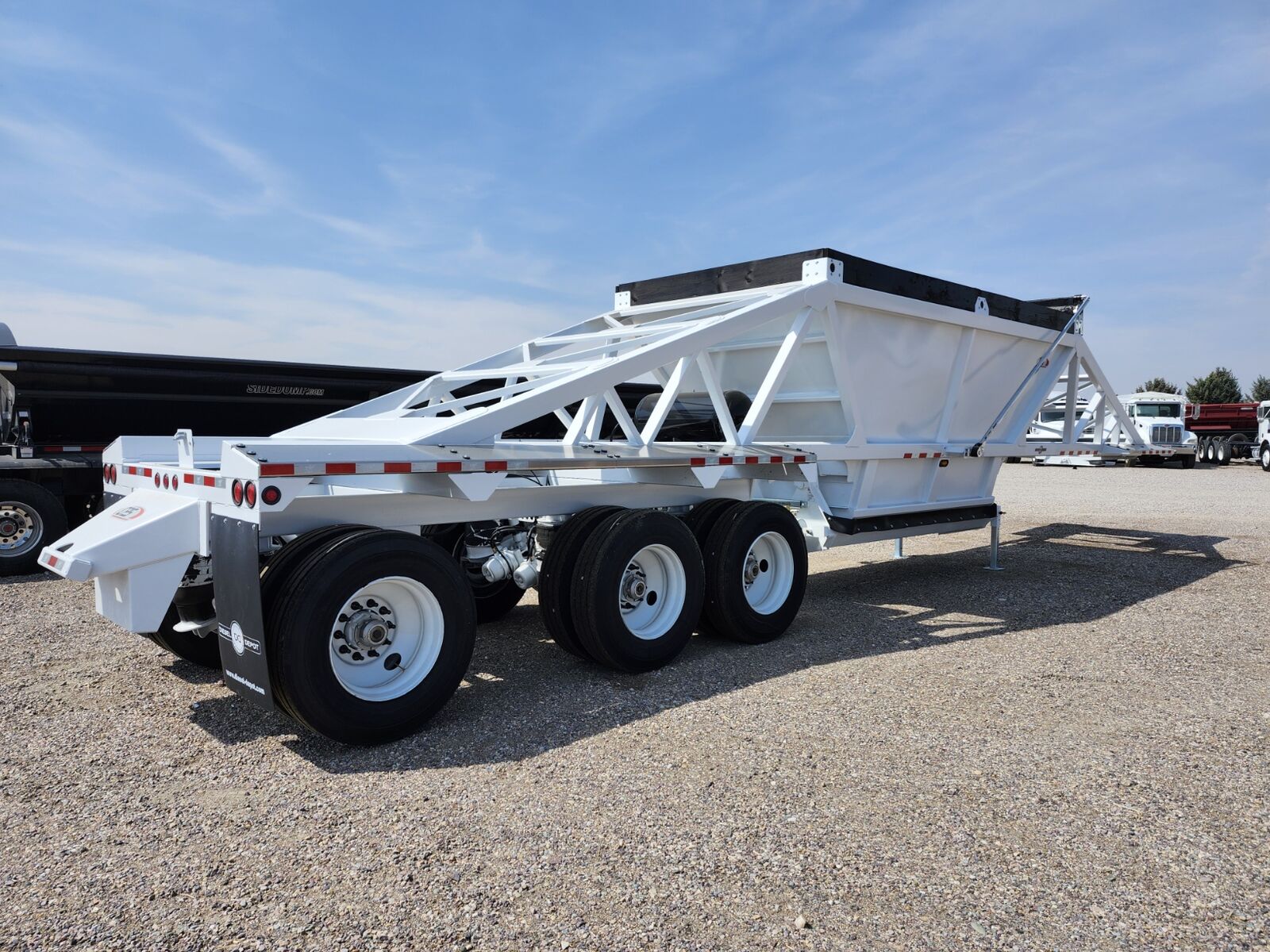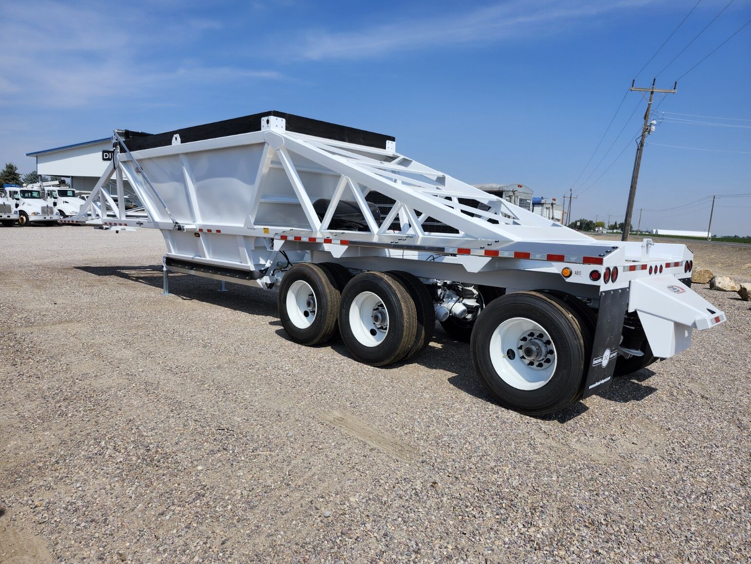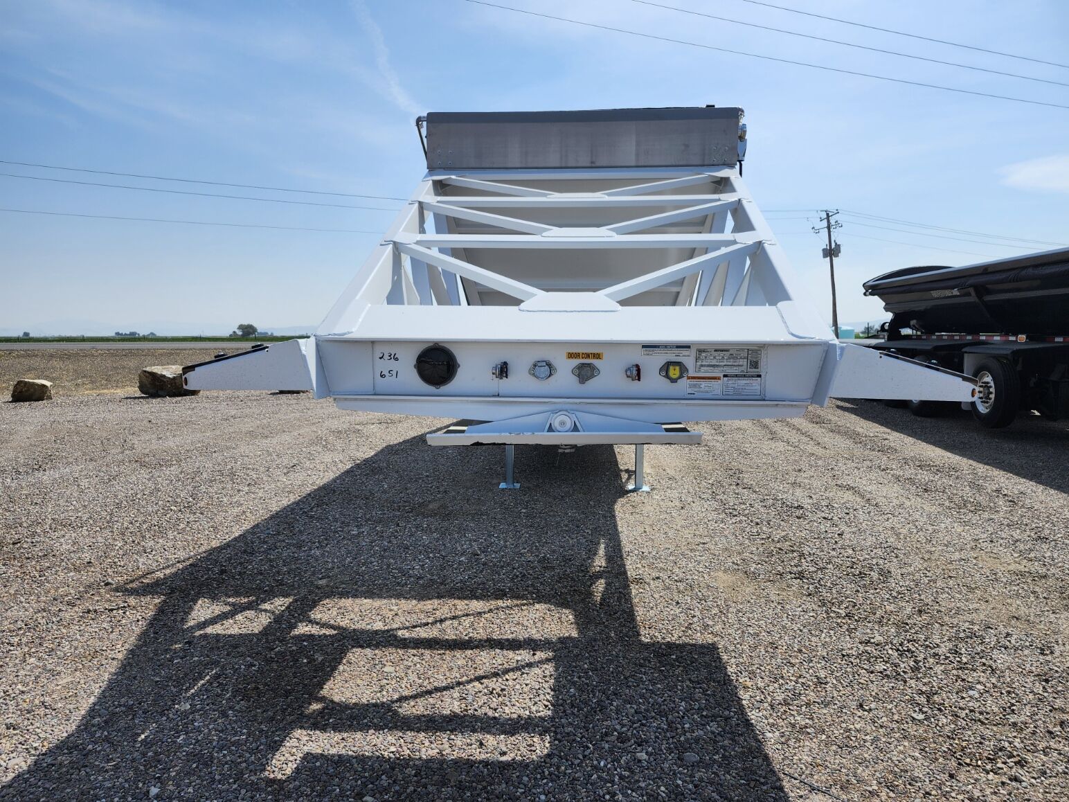 New 46'6" x 102", 26 cubic yard heaped, 3rd axle liftable-non steerable, 77" 3rd axle spread- 50" 1st/2nd axle, 18" Kingpin setting on ocillating 5th wheel plate, Electric roll over tarp, 25K axles, Hendrickson Air ride suspension, 3/16" 80W hopper doors, 4"x4" Square drop leg landing gear, 4" x 6" x 3/16" HSLA tube bottom and top rail, Weld on push block, Aluminum front/rear fenders, Empty weight of 16,000 lbs, (Price + FET and tax) MANAC 4B346A230