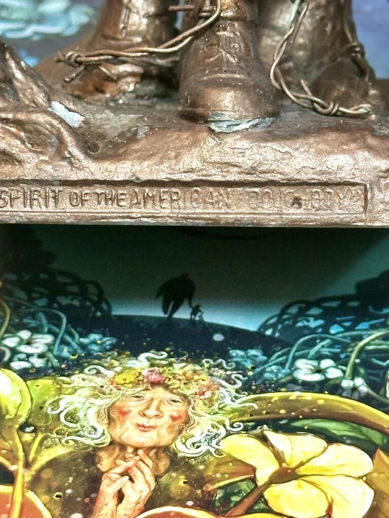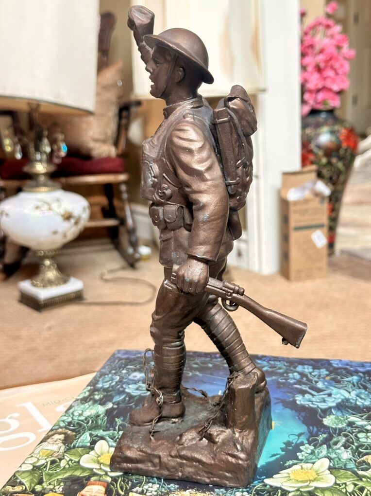 11 inches high. Rare sculpture by E.M. VIQUESNEY depicts a WWI doughboy (soldier) carrying a grenade and a rifle (rifle is broke off) also a crack on the back right shoulder. Made of Bronze-finished spelter (pot metal alloy) highly collectible! This is an authentic miniature version of “The Spirit of the American Doughboy” by Ernest Moore Viquesney of Americus, Georgia. Viquesney’s Doughboy became the most iconic WWI memorial statue in America, with over 150 life-size versions installed nationwide in the 1920s and 1930s. This smaller commemorative casting was produced for collectors and veterans’ families during the same period and remains a highly sought-after piece of WWI militaria.
