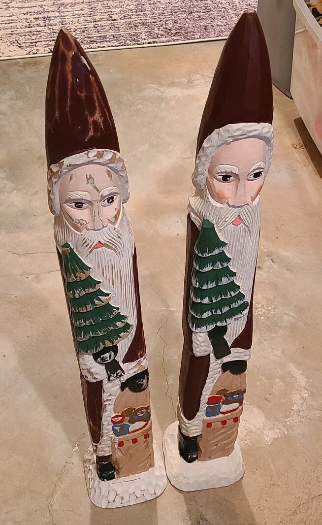 2 tall carved wood Santa's about 3' tall They are slightly different- one has a more antique distressed look.