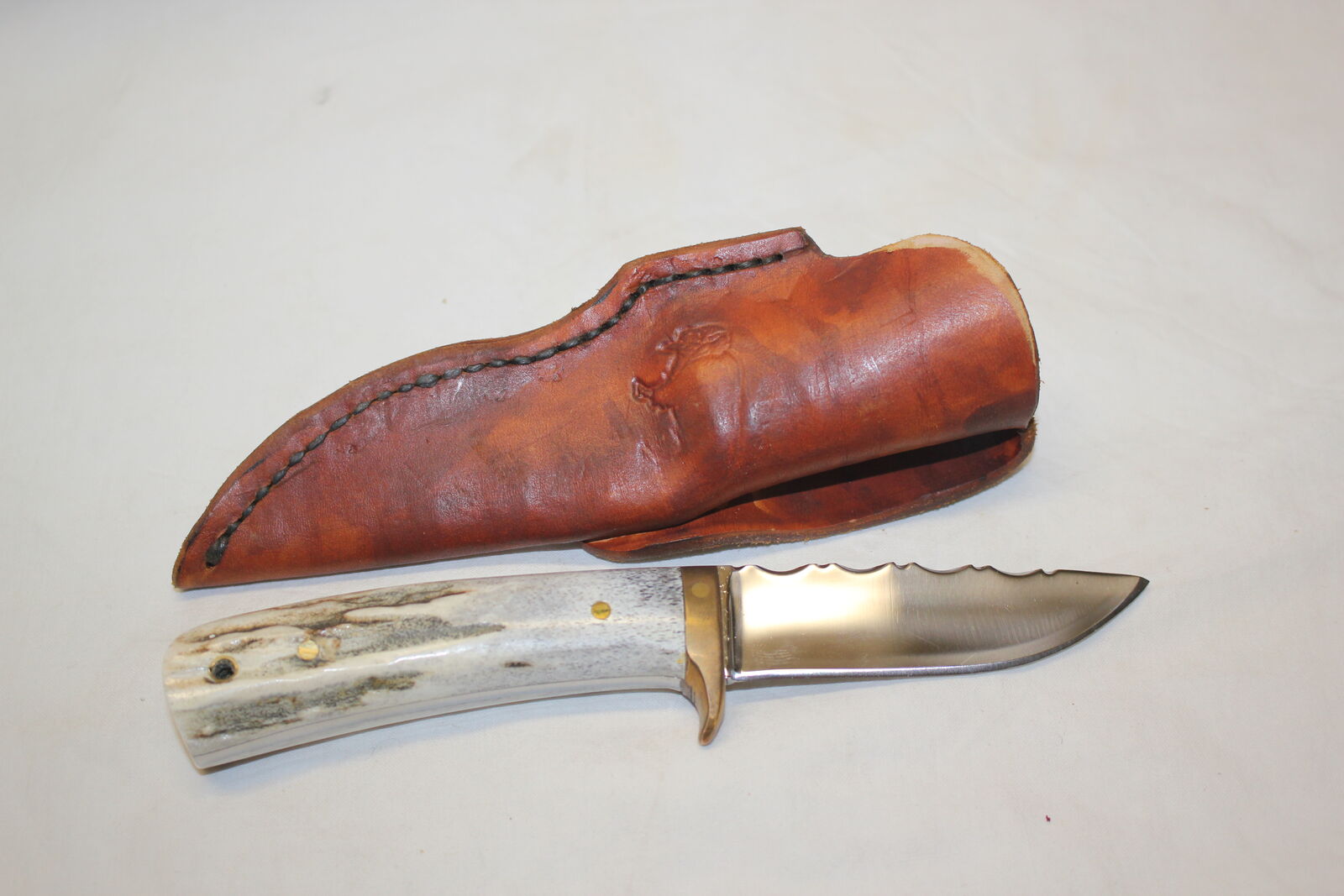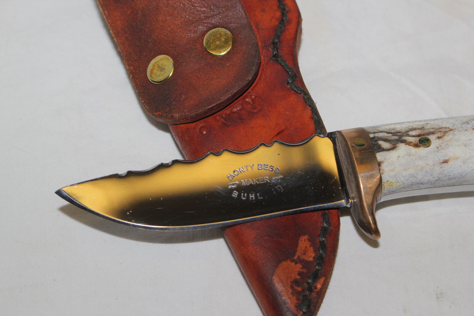 Starting to thin our my knife collection: Custom handmade fixed blade knife by Monty Bess of Buhl, Idaho. 4" hollow ground blade, stag handle with brass pin, sculpting filework on top edge of blade, with handfit custom leather sheath. Very fine size for almost any hunting or general use (not too small and not too big). 100% new condition. Cash only, trades/offers considered.