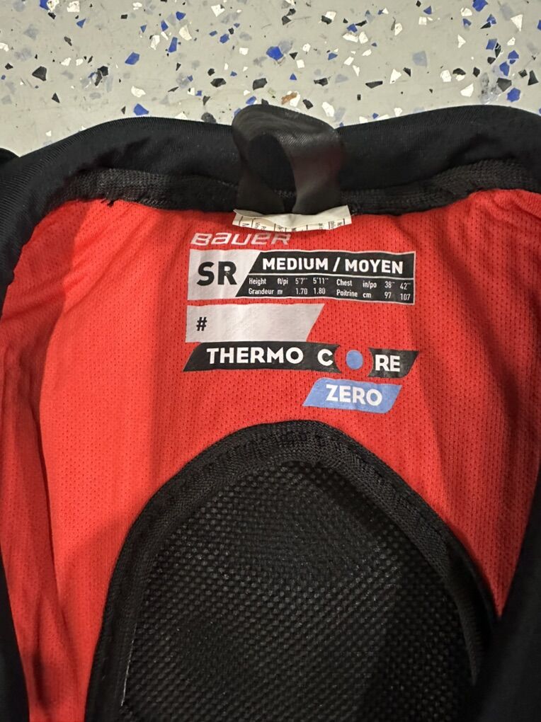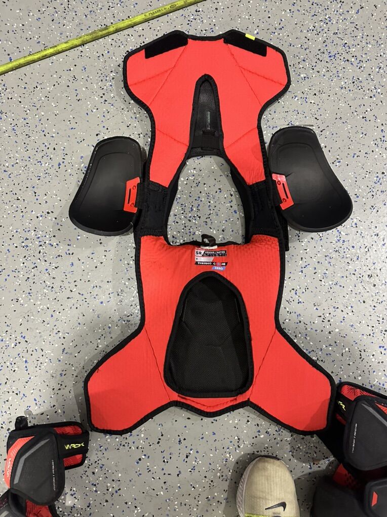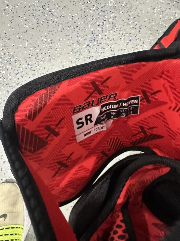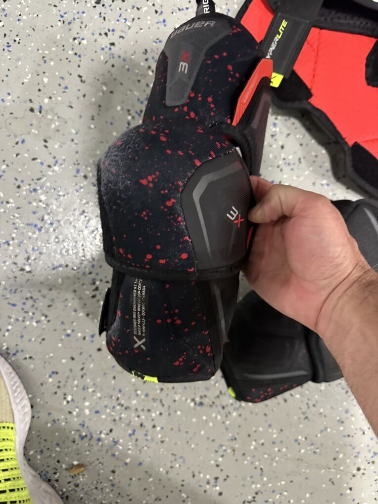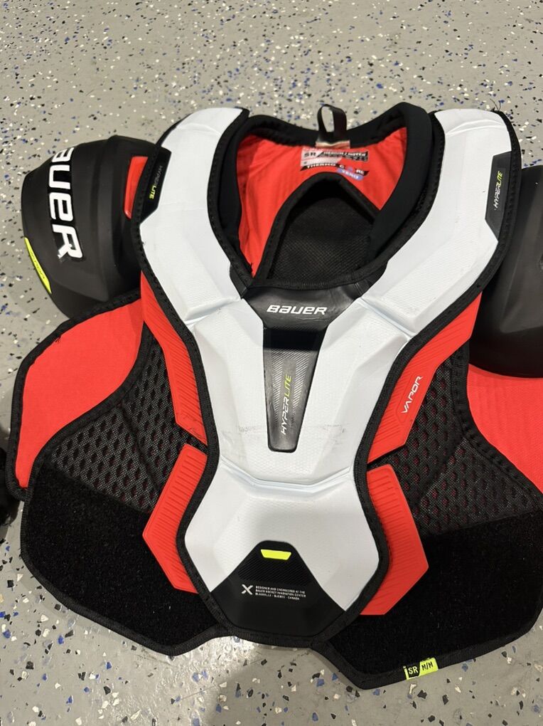 The shoulder pads are the Bauer Vapor hyperlite Senior medium pads, only worn for 2 practices, in very good shape. The bicep guards have been removed and are not included, which frees up mobility.
