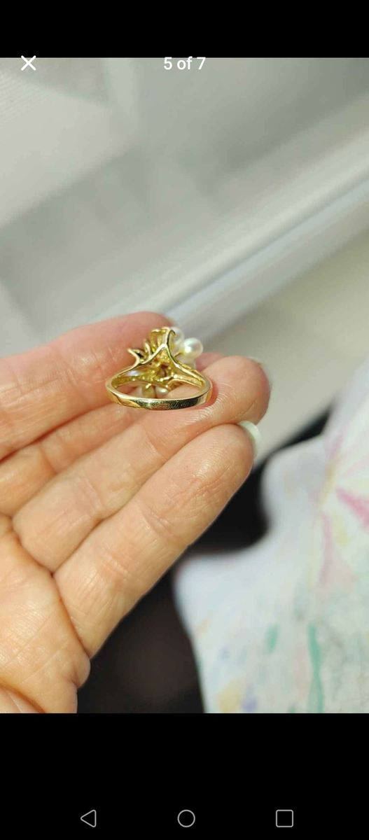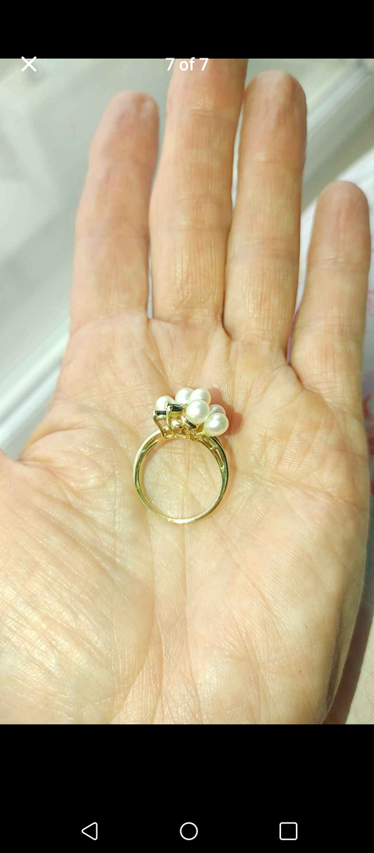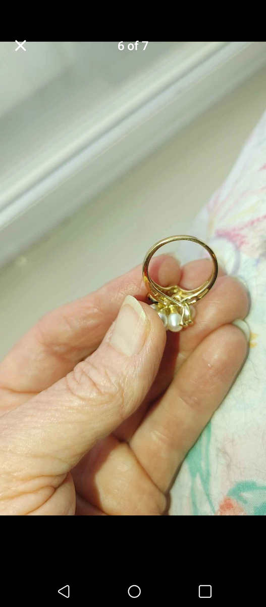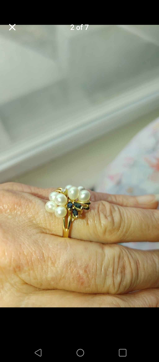 Previously worn, but in great shape. Stamped 14 K Gold. This size 7 vintage ring features 8 oval pearls, 1 diamond & 3 marquis sapphires. Cash only. All proceeds benefit Bella Furever Friends Feline Rescue.