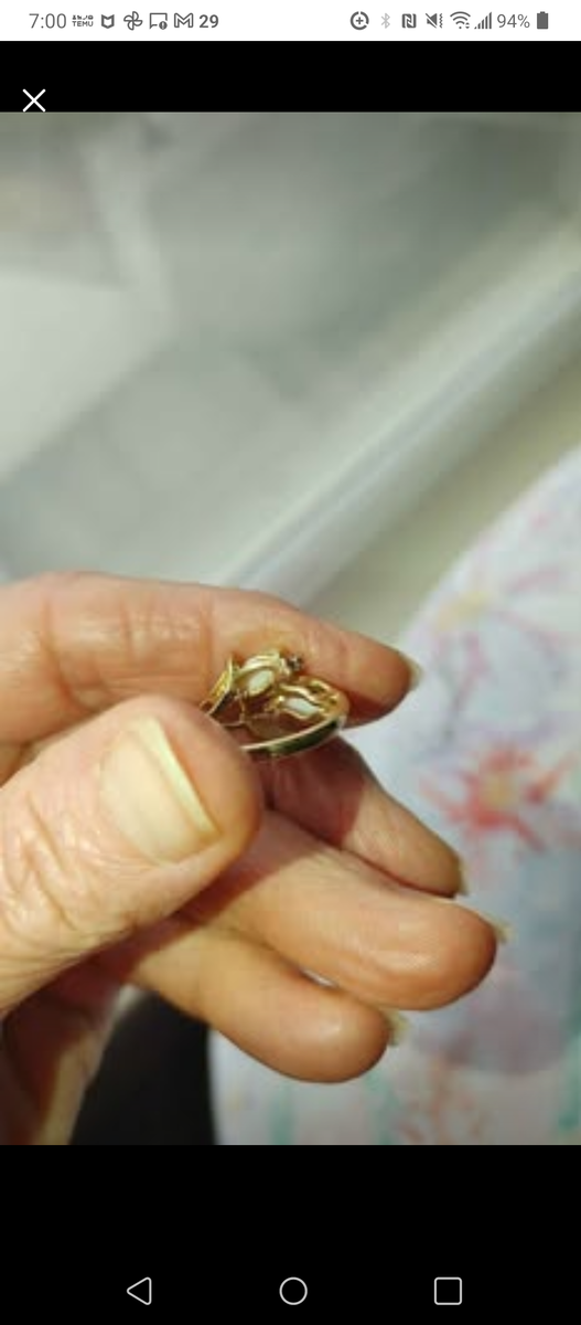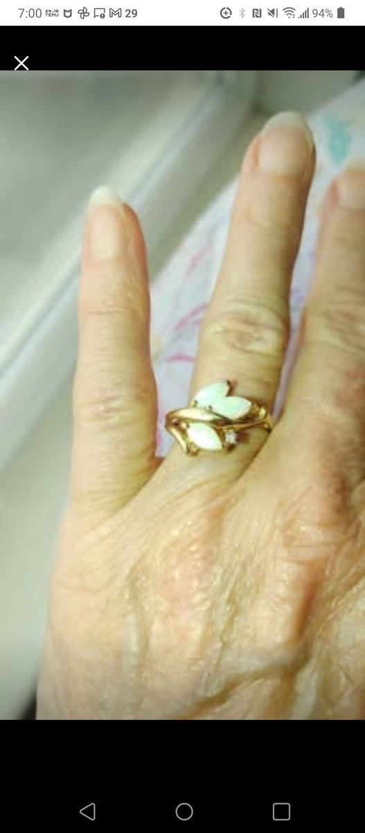 Previously worn a size 7. 3 marquise opals in a 14K gold setting with a small diamond. Cash only. All proceeds benefit Bella Furever Friends Feline Rescue.