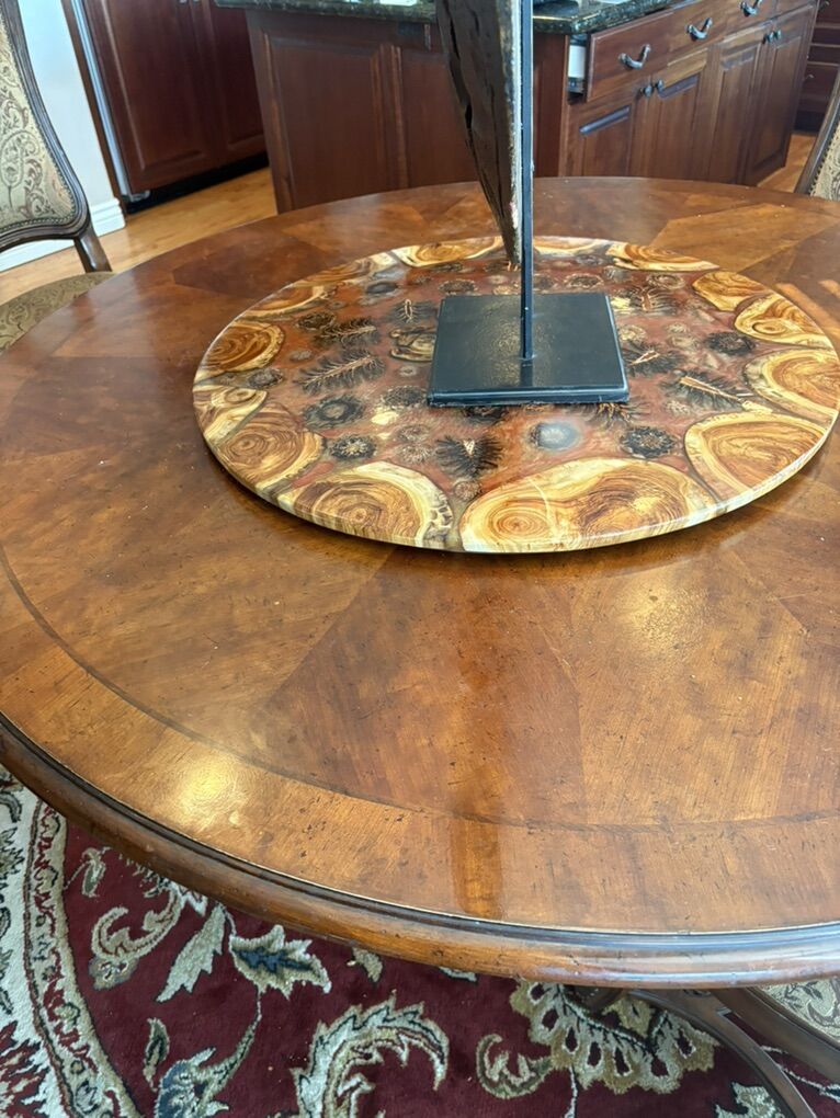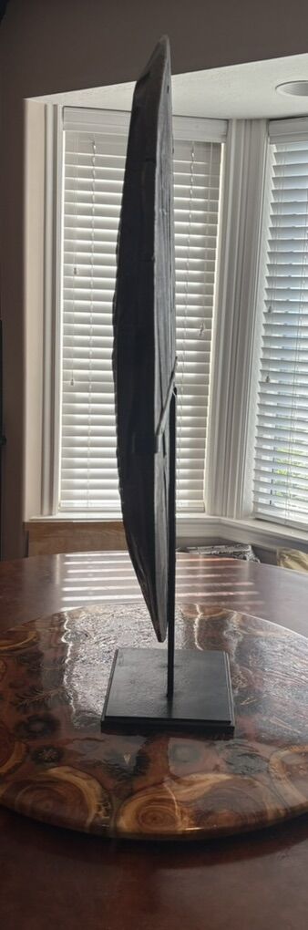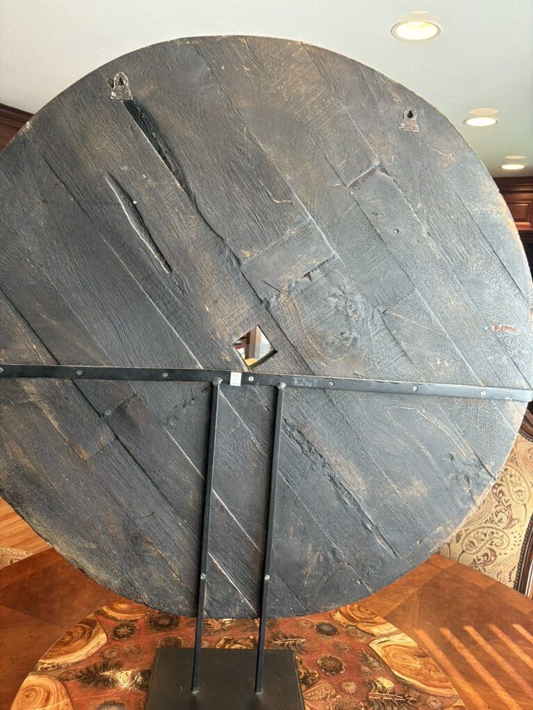 VenmoAntique cart wheel replica .Antique or distressed finish . Made in India. It has a very heavy metal stand. It measures 36X36 in Diameter mounted on stand it is .. 41x36 This is a beautiful statement piece Price drop 250.00