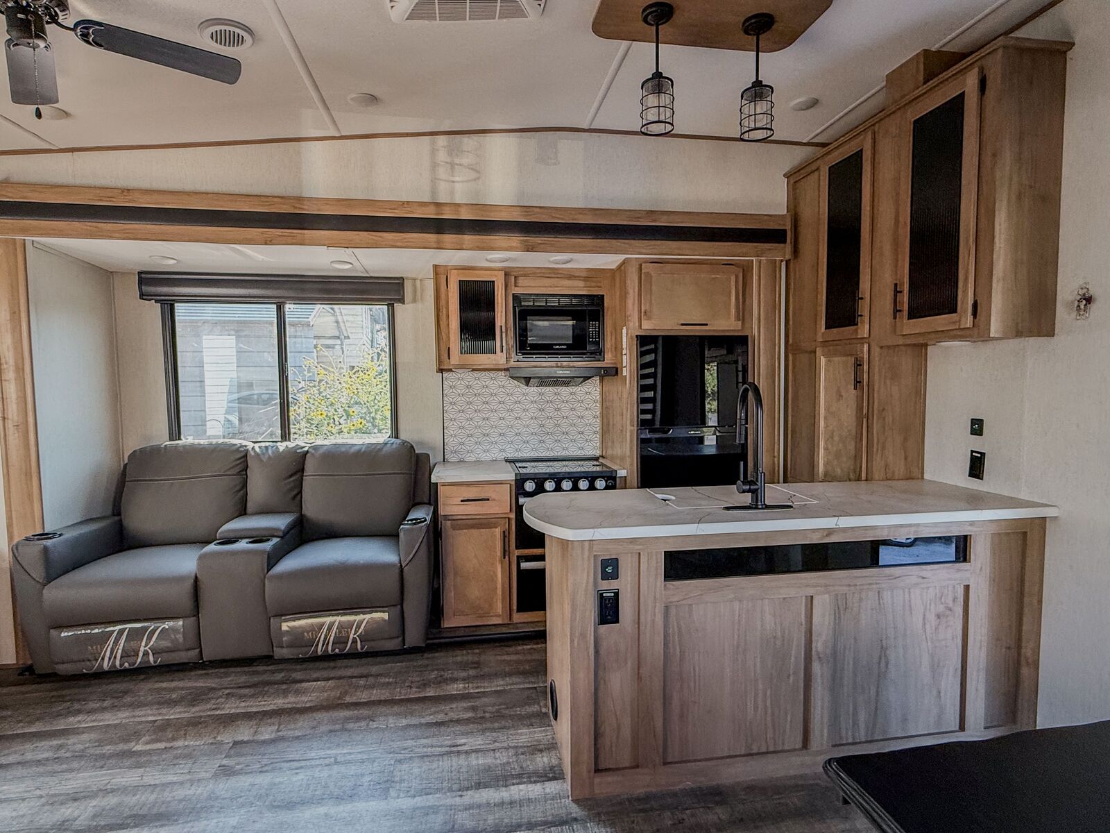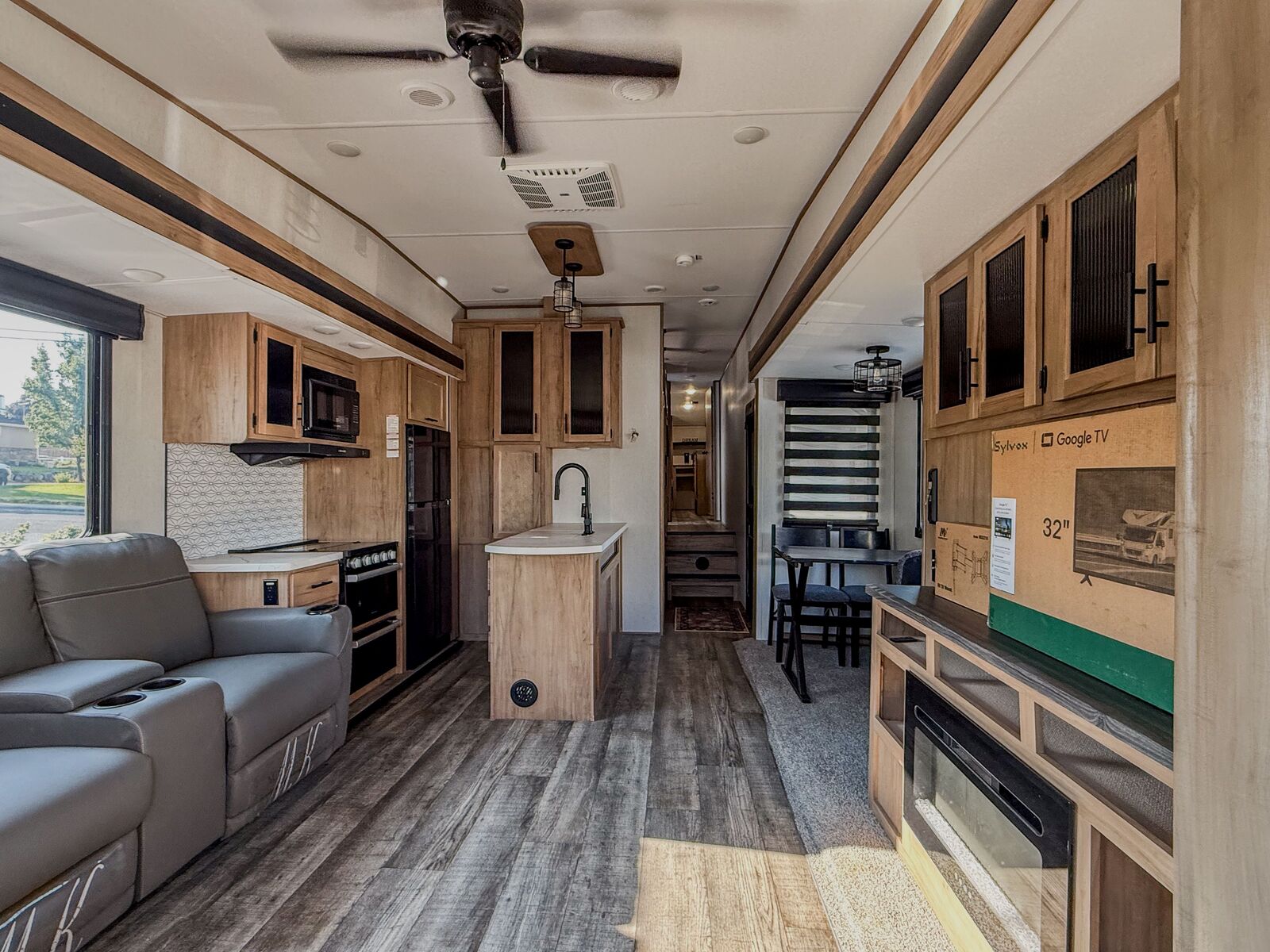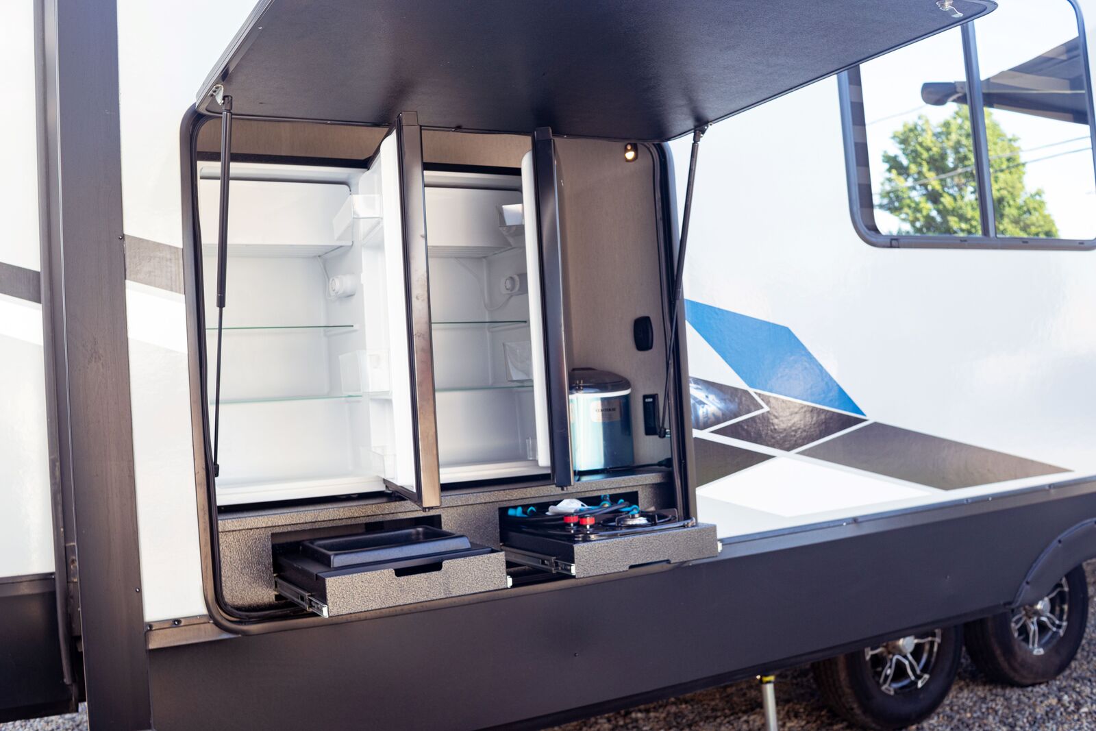 Features an upgraded 12v residential refrigerator, a three-burner range, and a spacious pantry and countertop.