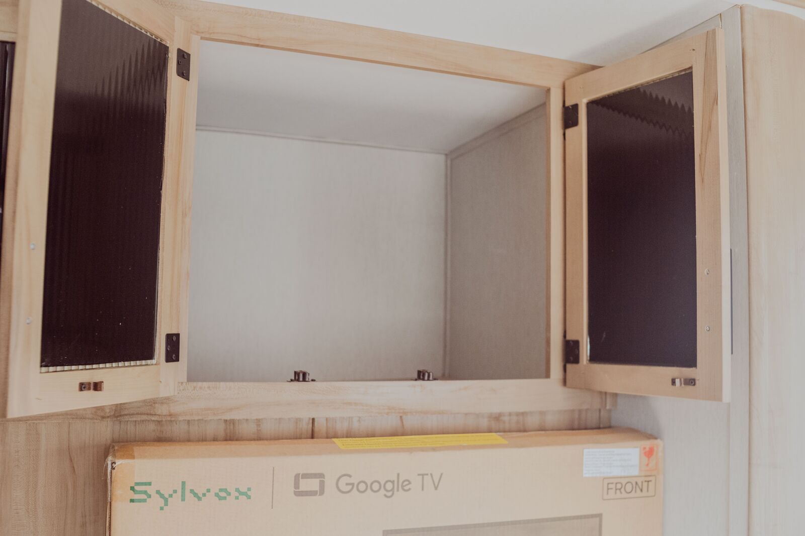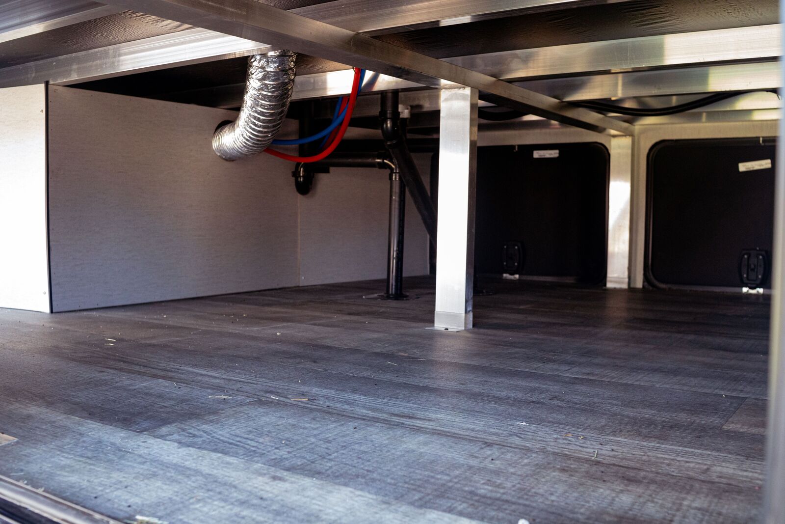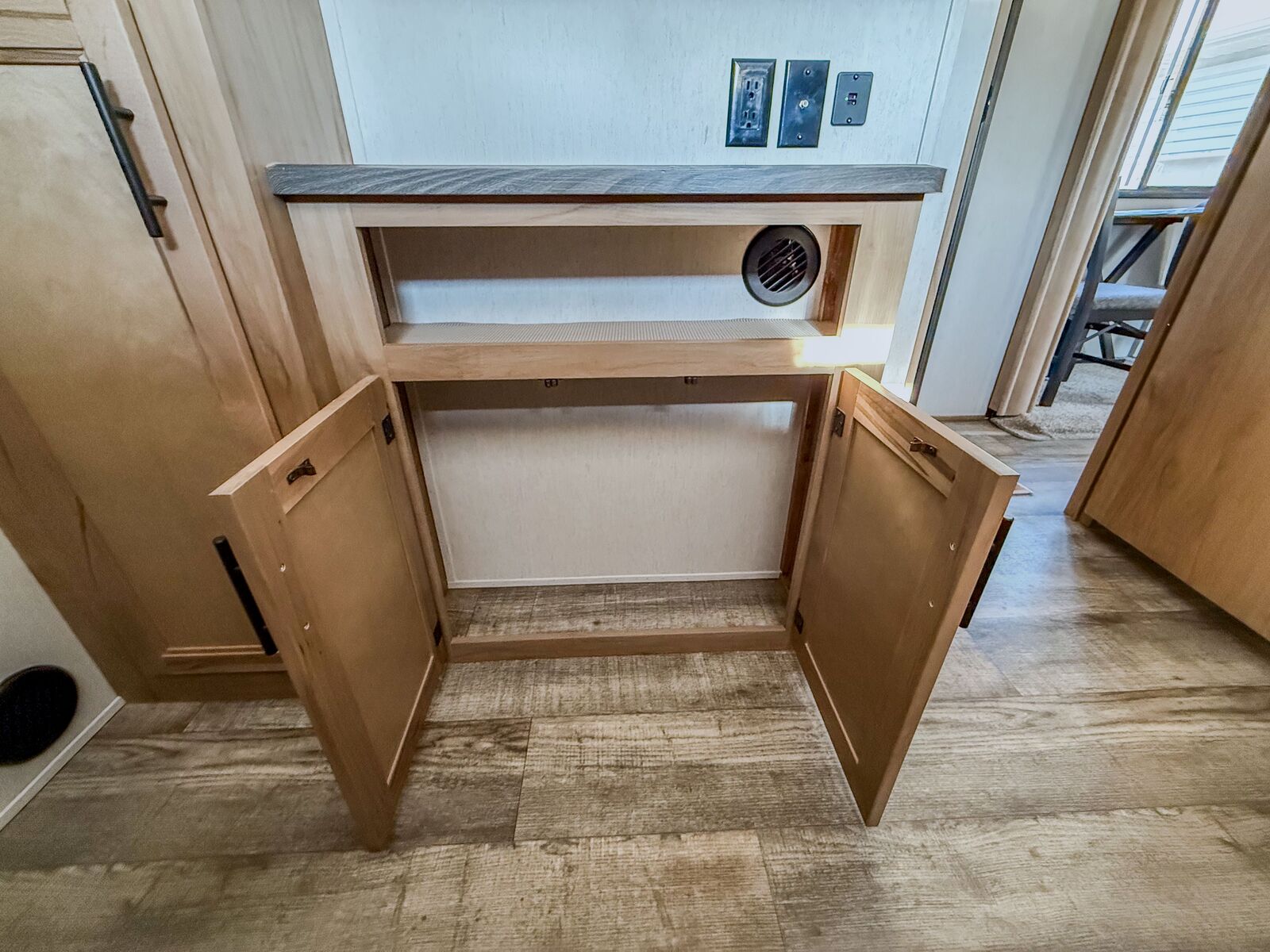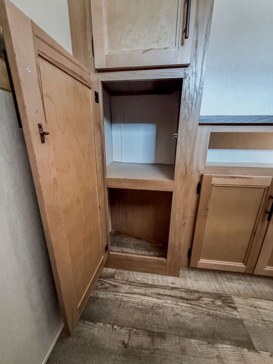 Features an upgraded 12v residential refrigerator, a three-burner range, and a spacious pantry and countertop.