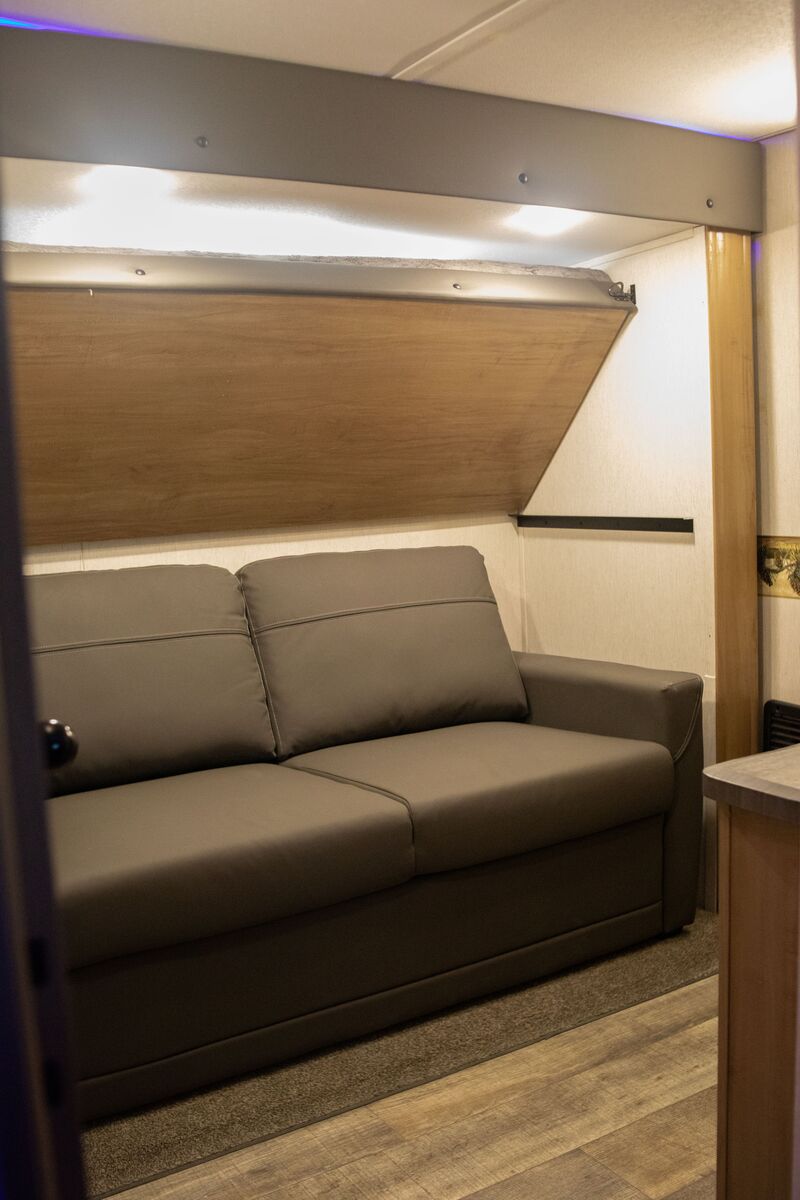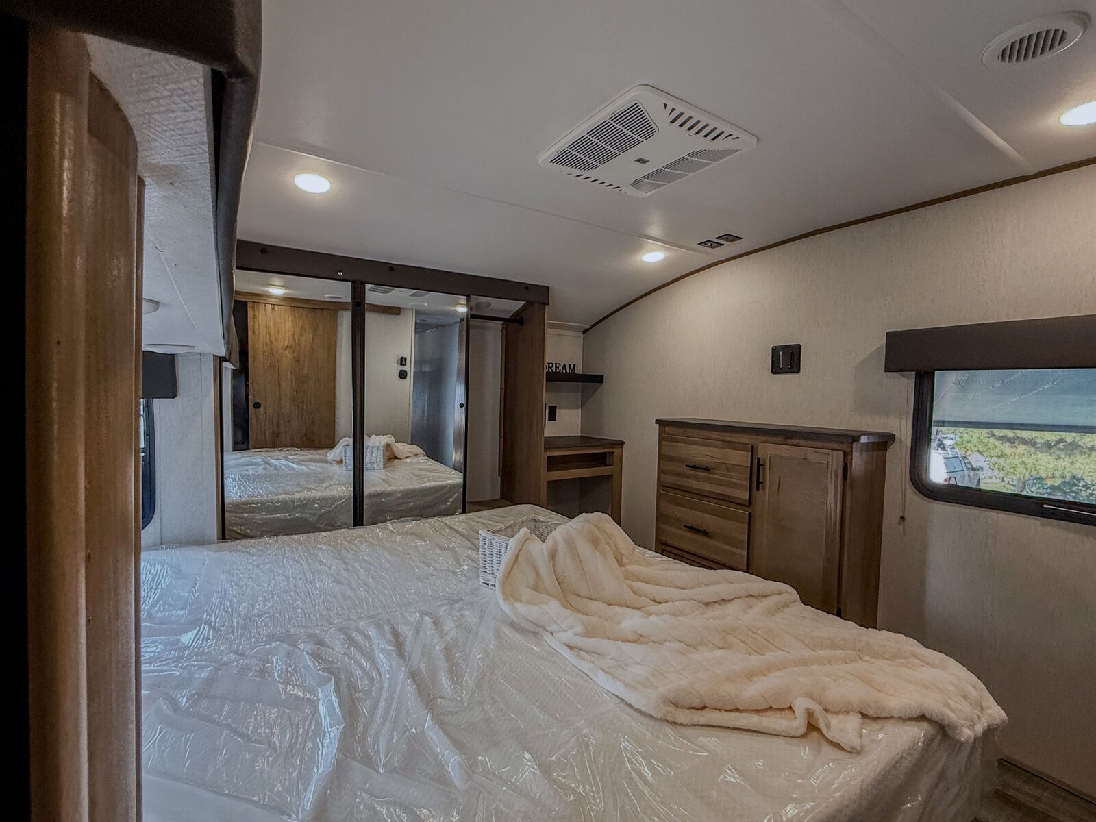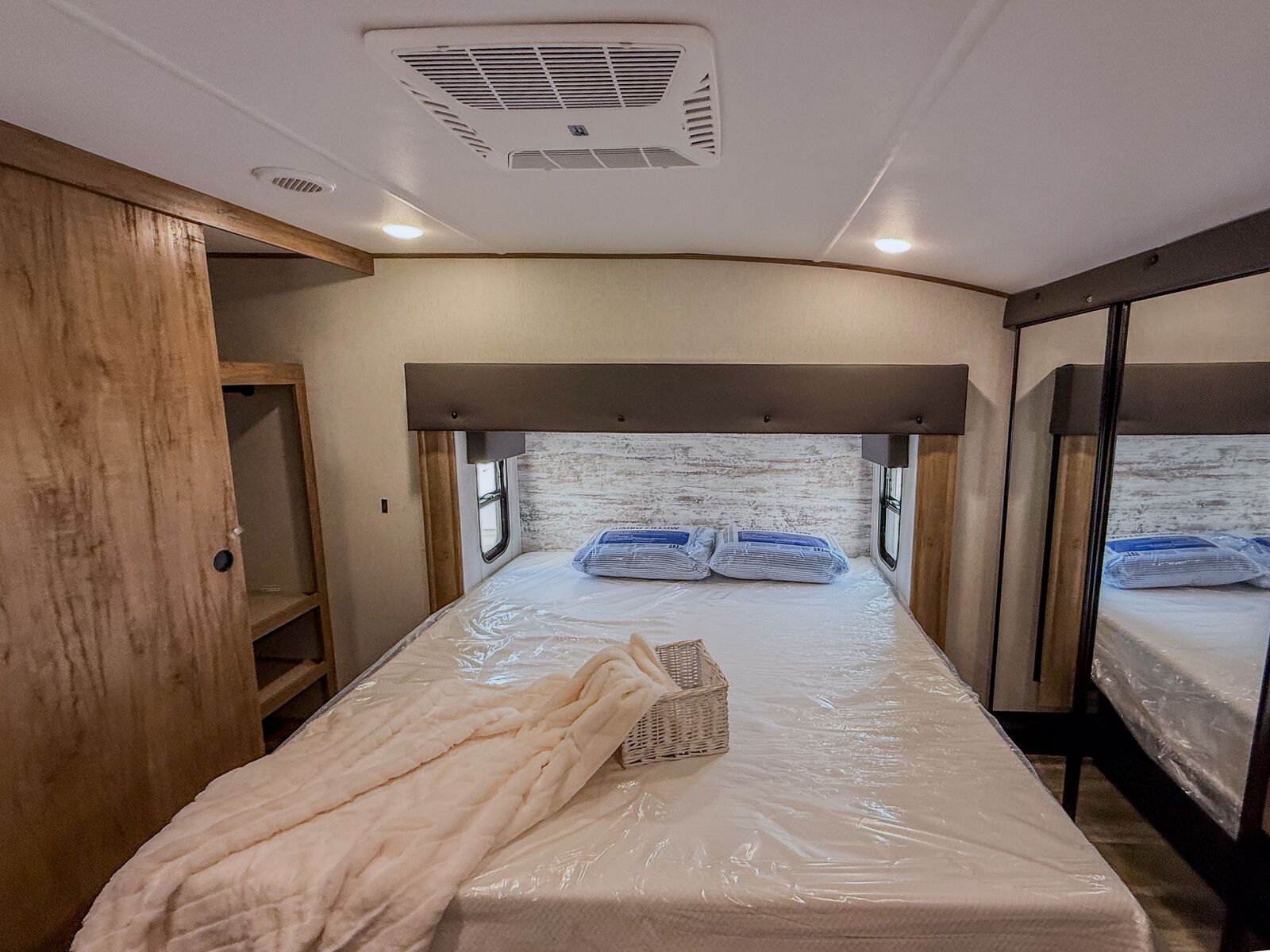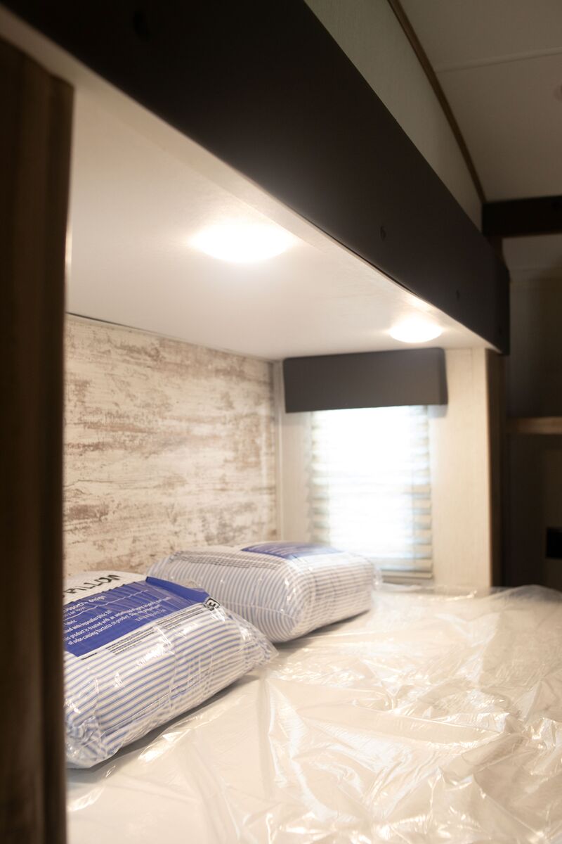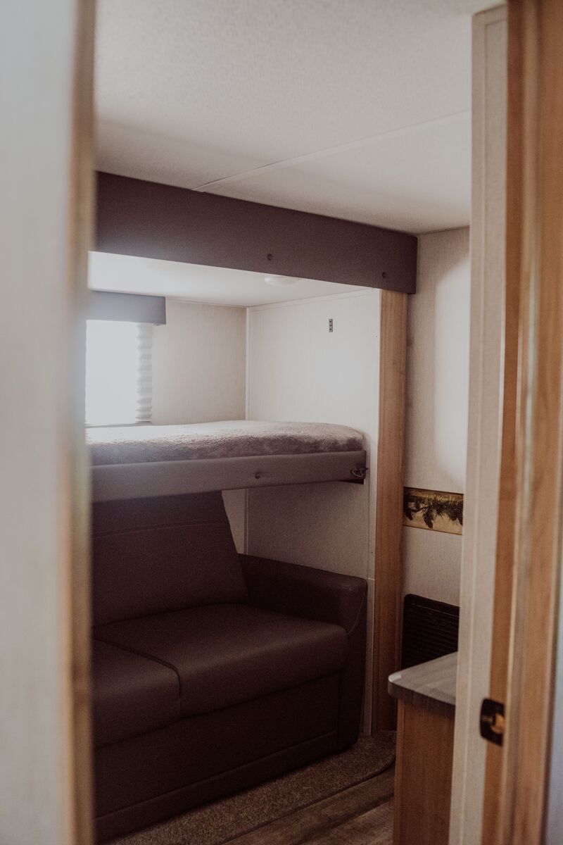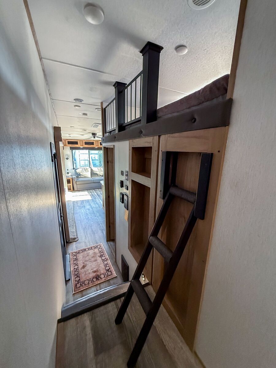 A mid-bunk loft above a 2nd bedroom (with a 2nd tri-fold sofa and bunk) and a master bedroom with a NEW king size mattress.