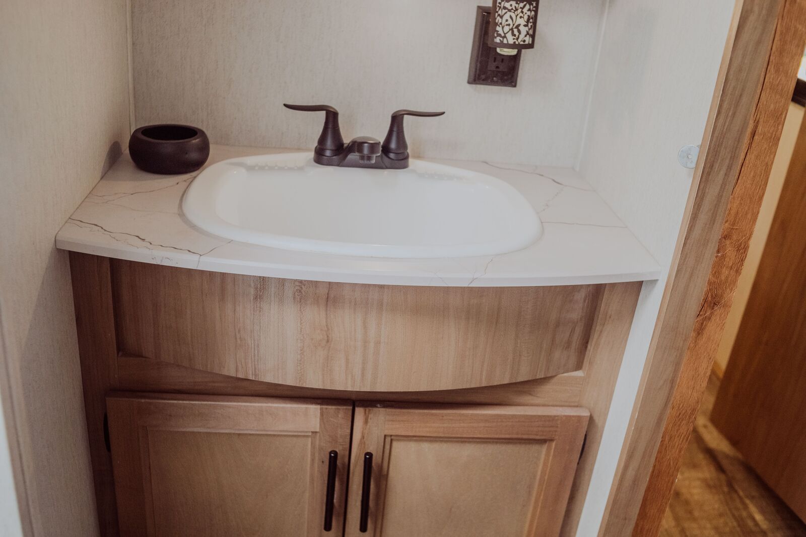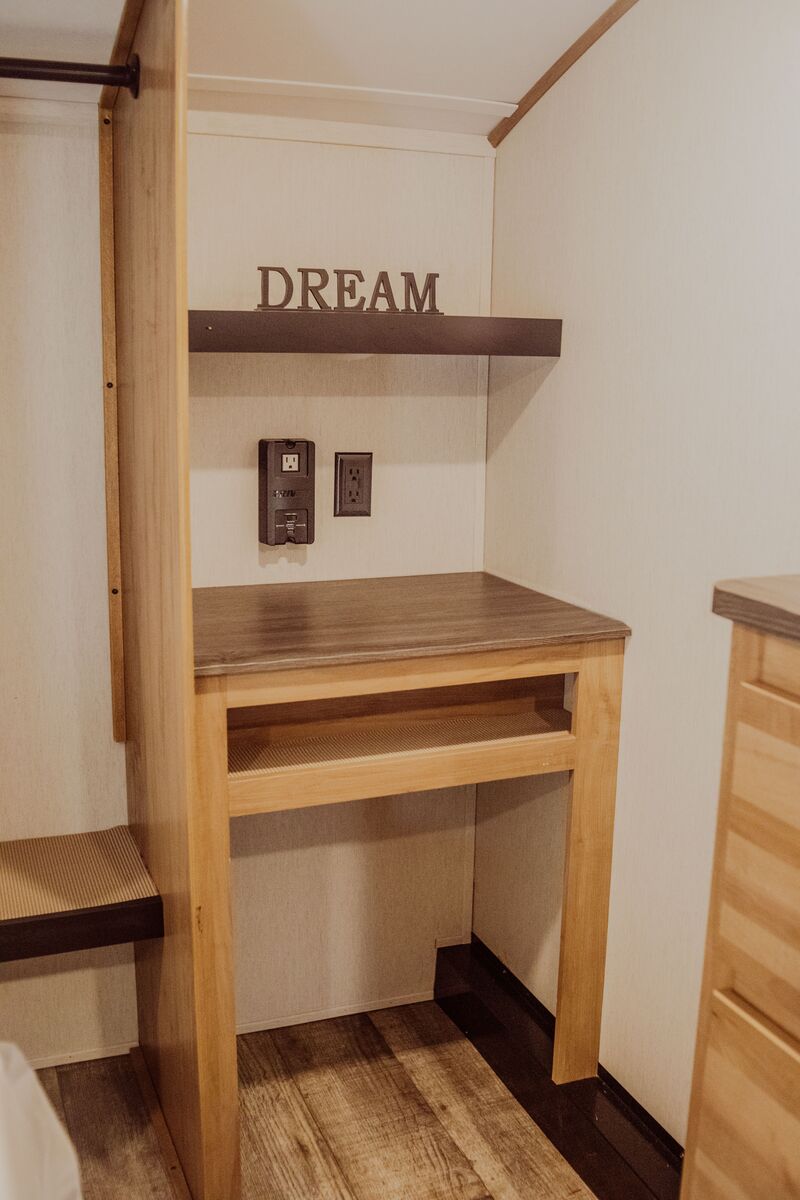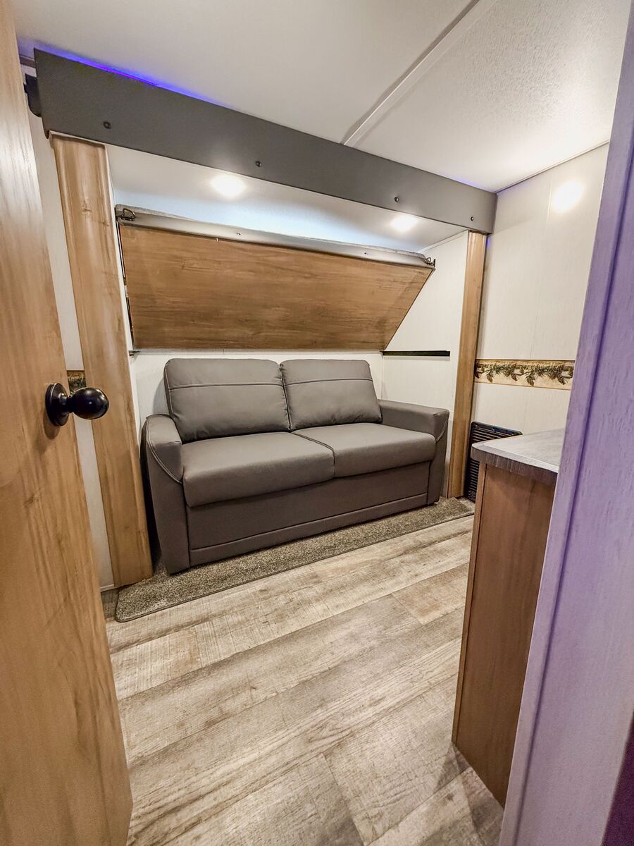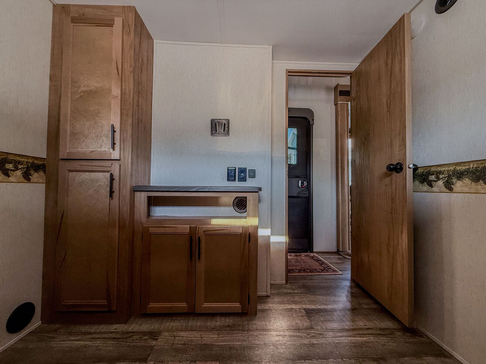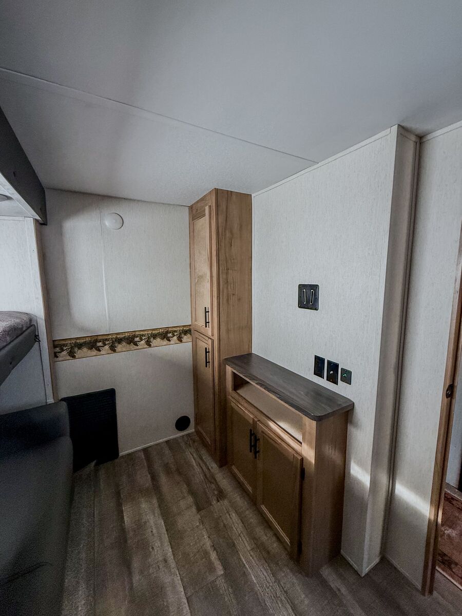 A mid-bunk loft above a 2nd bedroom (with a 2nd tri-fold sofa and bunk) and a master bedroom with a NEW king size mattress.
