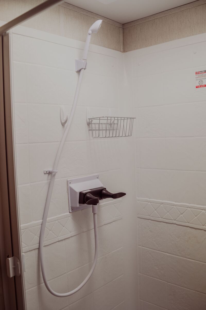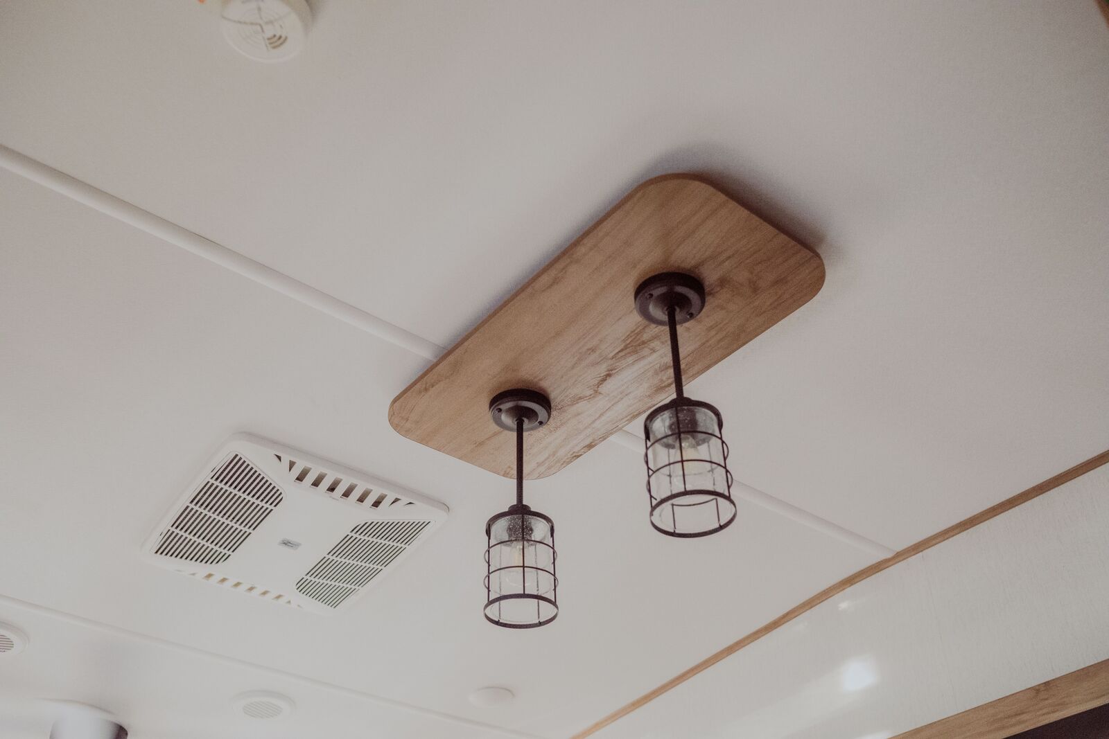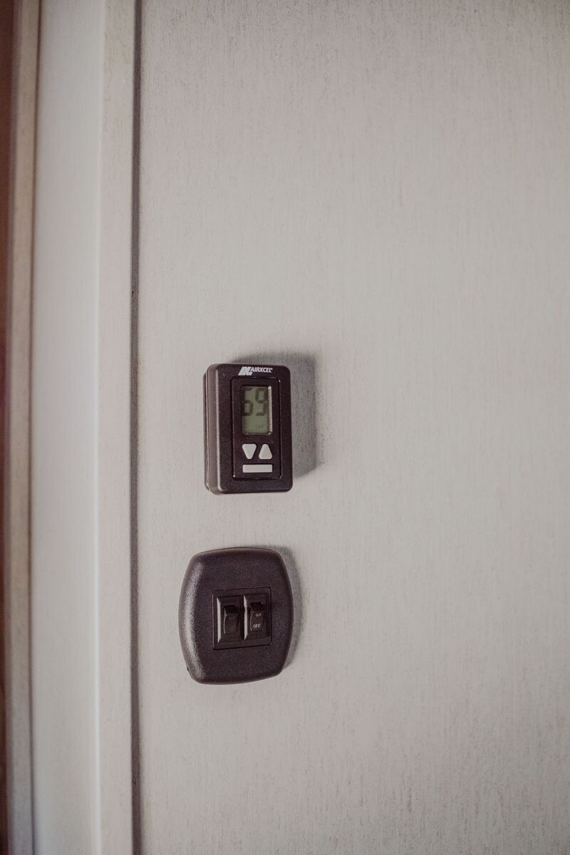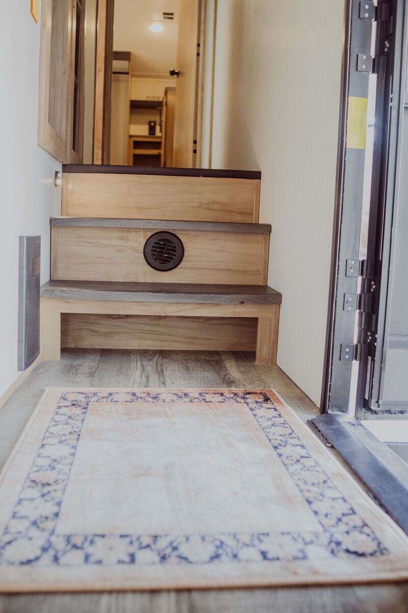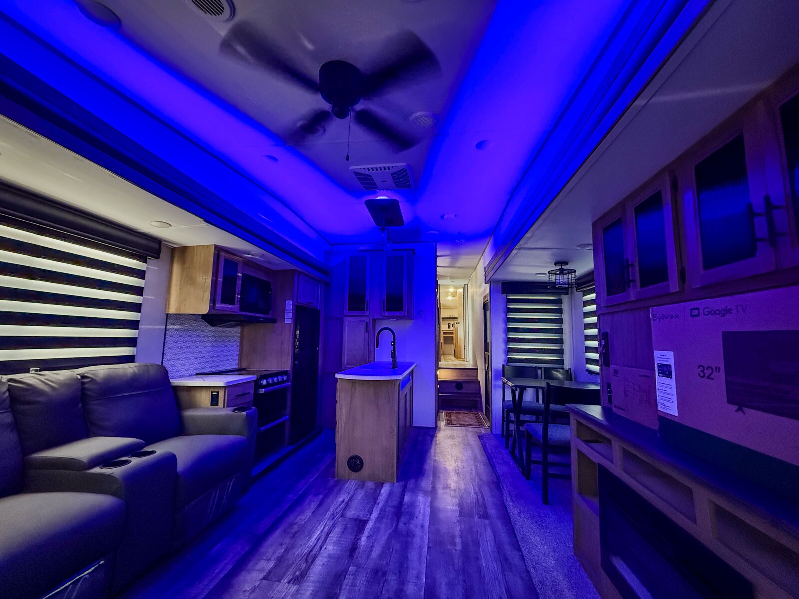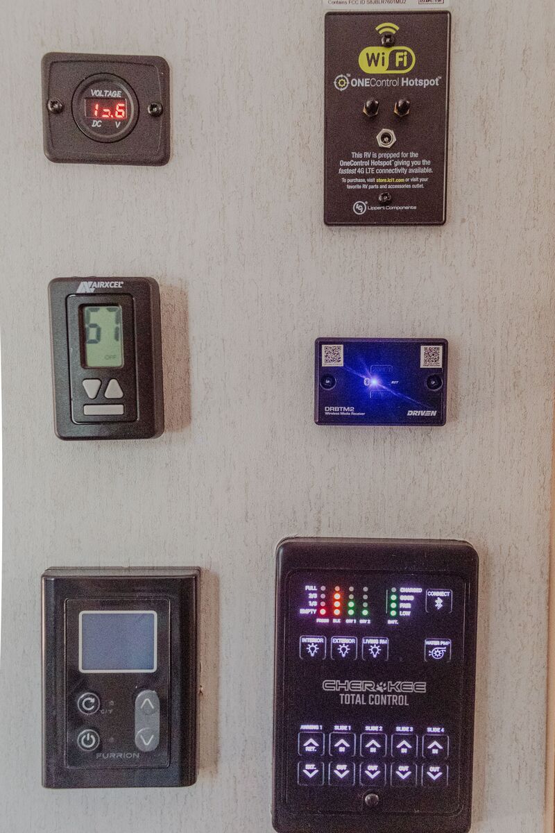 Total Control® Smart RV Technology, a smart monitor panel with smartphone Bluetooth connectivity, and motion-sensing lights in the bedroom, bathroom and indoor steps.