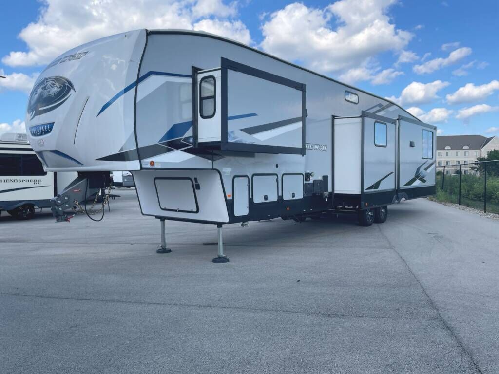 The Arctic Wolf Suite 3660 is a 5th-wheel RV with a length of approximately 43 feet long and 13' tall, a dry weight around 10,828 lbs, and a GVWR of 13,655 lbs.
