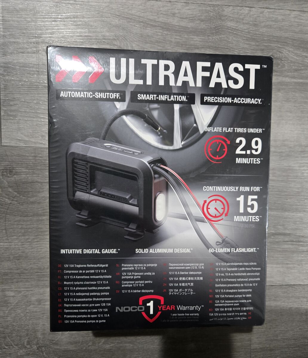 VenmoINTRODUCING NOCO AIR15 — The next generation of portable air compressors utilizing advanced motor and airflow design with uncompromising performance for tires up to 33-inches. It runs longer, fills faster, and infinitely better. ULTRAFAST INFLATION — Delivers 44 liters per minute of high-output airflow - far beyond typical inflators - to rapidly inflate from 0 to 40 PSI in just 2.9 minutes. Or quickly top-off low tires (35-40 PSI) in less than 29 seconds. RUN LONGER — Its superior duty cycle simply does more work than comparable inflators by allowing continuous operation for 15 minutes. Coupled with its fast inflation, it can fully inflate four tires from 0-40 PSI in one duty cycle. SMART PRESSURE — An integrated pressure sensor and innovative dwell technology pause and resume inflation as the pump reaches its set pressure. It automatically shuts off while monitoring and measuring pressure without over-inflating, providing precision accuracy. INTUITIVE INTERFACE — A digital display allows accurate pressure settings from 15 to 80 PSI, selection between PSI, kPa, and bar pressure measurements, and selection of various flashlight modes, including SOS. Or, utilize the manual mode for applications below 15 PSI. WHAT'S IN THE BOX — AIR15 15-Amp Portable Car Tire Inflator with 3-Foot Braided Inflation Hose and a 10-Foot Power Cord with a 12V Cigarette Lighter Plug, Multiple Adapters (Presta Valve, Needle, and Inflatable Toy), Microfiber Storage Bag and 1-Year Limited Warranty.