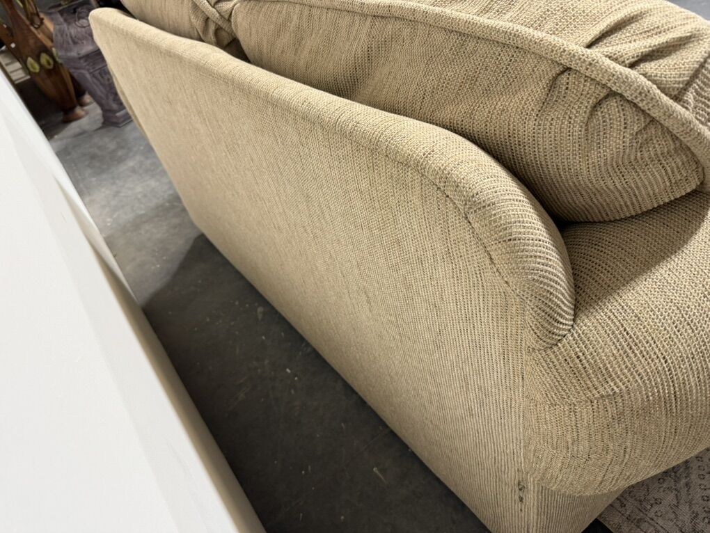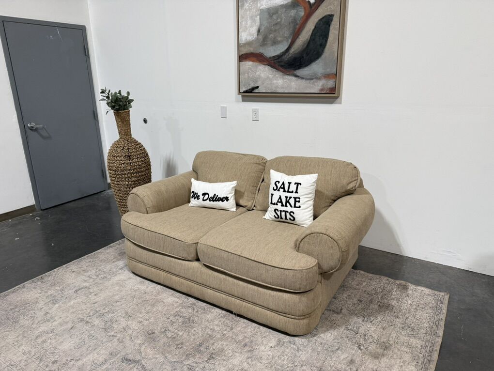 Follow Us On Instagram: SaltLakeSits Retail Price: $1400 Your Price: $325 ️ Beige Bassett loveseat with wide, rolled arms and deep cushioned seating. Upholstered in a textured fabric, it offers a soft and inviting look with two plush back cushions and generously deep padded seat cushions. 🫧 Expertly Cleaned 🫧 Dimensions: 63” x 40”