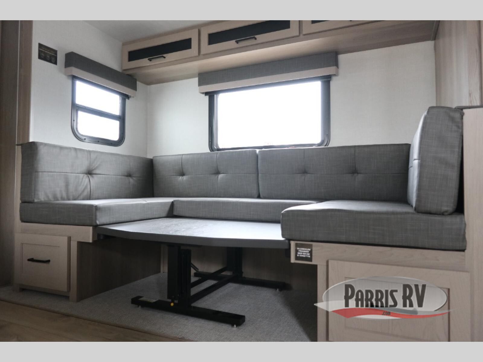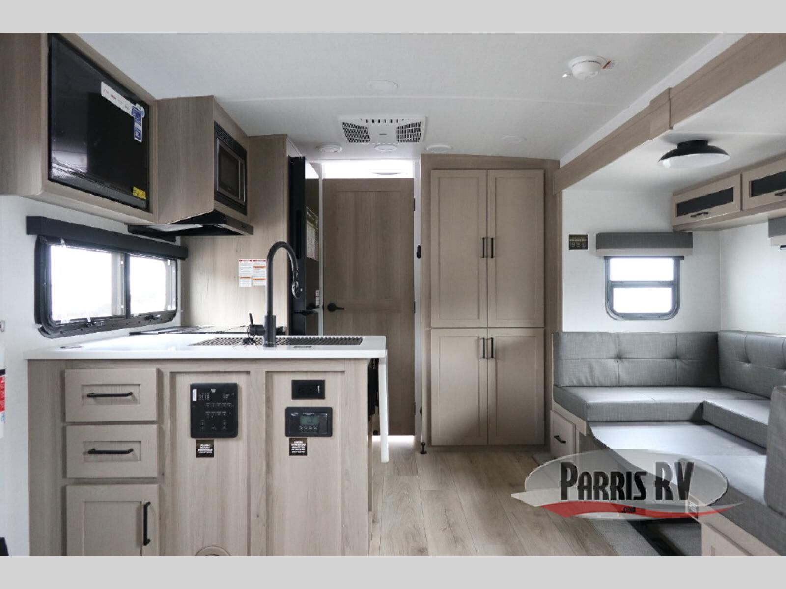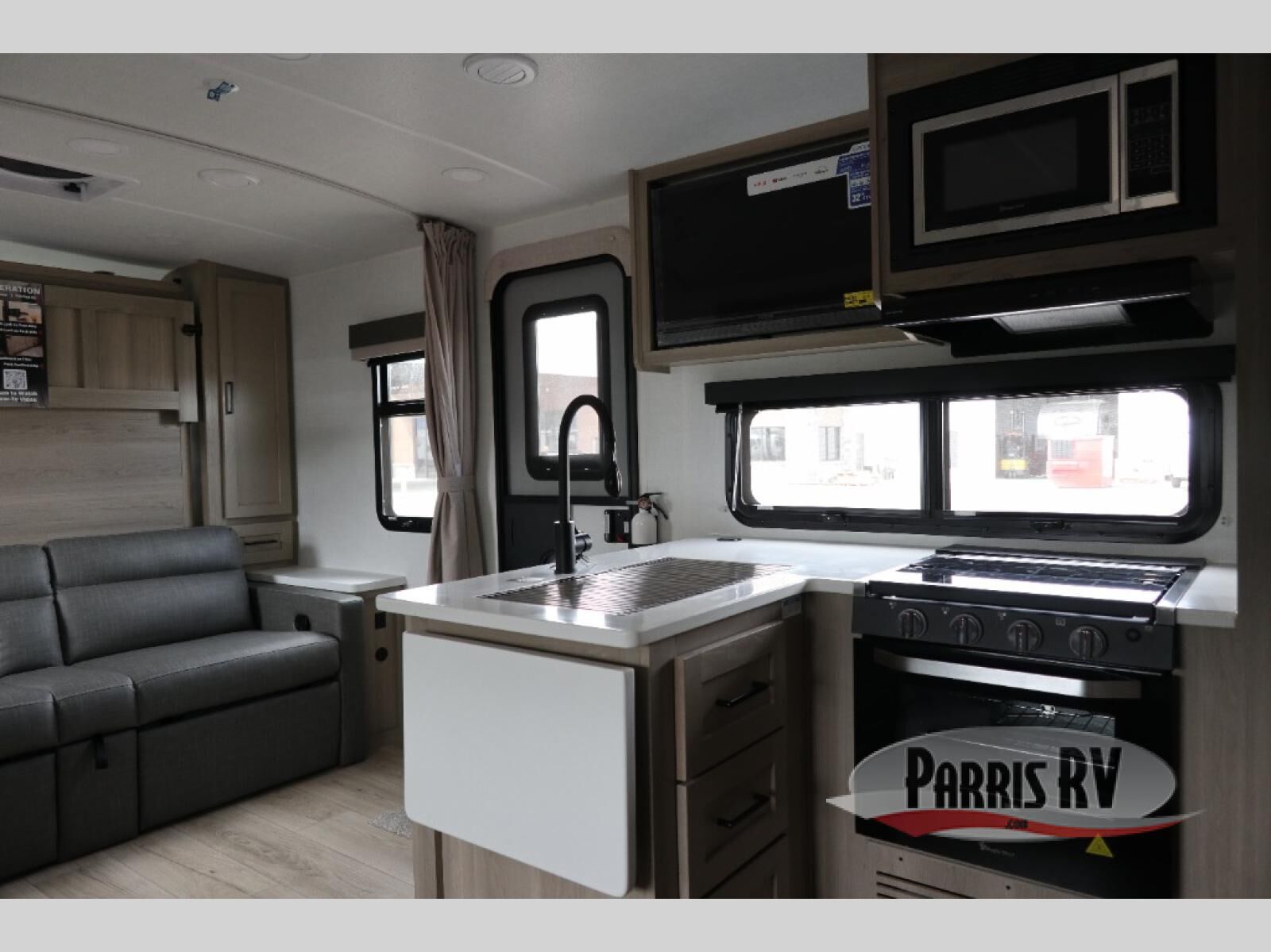 This versatile and cozy travel trailer will be perfect for weekend trips to the lake. Once you arrive at your campground, you can unload the water toys from the pass-thru storage, put out the 15' power awning, then make lunch on the exterior griddle. The U-shaped dinette slide inside will provide a place to dine, play board games, and let a guest or two sleep over, while you take the RV queen-size Murphy bed up front. In the morning, just fold up the bed to expose the 74" sofa! There is a three burner cooktop and microwave oven in the kitchen to make meals each day, along with a 12V refrigerator to keep leftovers fresh.