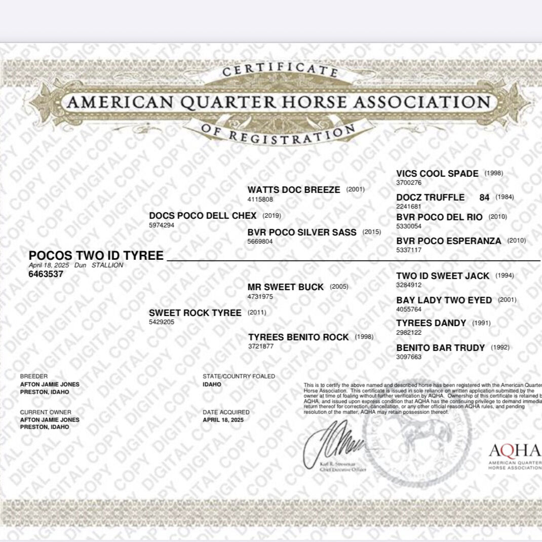 Will be getting gelded soon Pocos Two ID Tyree AKA Rocky is a 2025 colt out of Sweet Rock Tyree & Docs Poco Dell Chex. He has a fantastic disposition and has been worked with since birth. He’s easy to catch, lead, and has had his feet trimmed. Rocky would be a great stallion prospect with the mind he is & he is sure to be a looker! I will sell him as a stud or if you want me to deal with getting him gelded, I will do so with a deposit. Call or text with anymore questions. $5,500 - open to partial trade on my end for a broke registered mare
