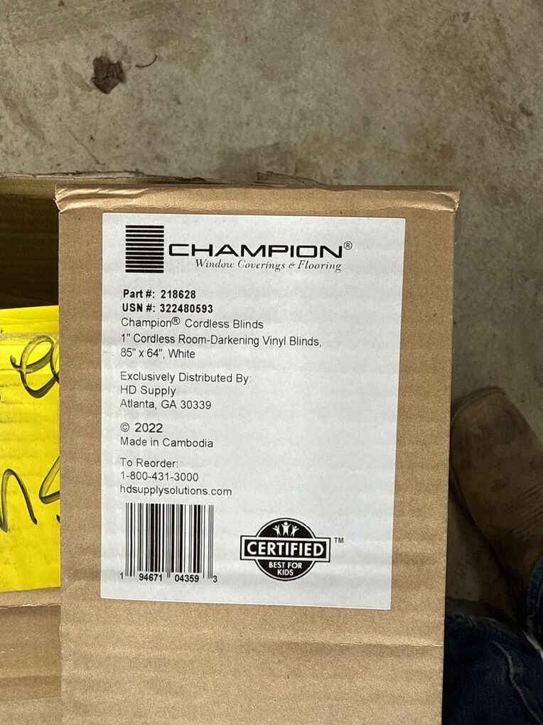 Champion 1″ Cordless Room-Darkening Vinyl Blind, White, 85″ × 64″, Part 218628