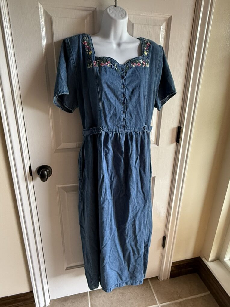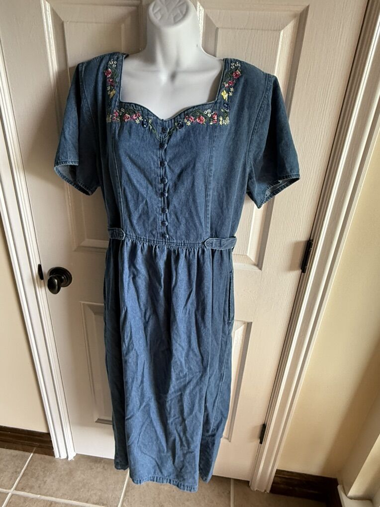 Vintage Erika dresses denim XL embroidered flowers tie in back.