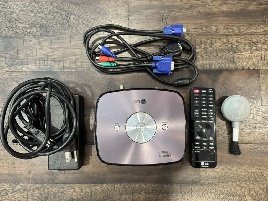 ZelleUsed less than 5,000 hours. Good picture with dim light. Can be mounted to hang on ceiling. Comes with remote and everything shown in picture. Has a carrying case.