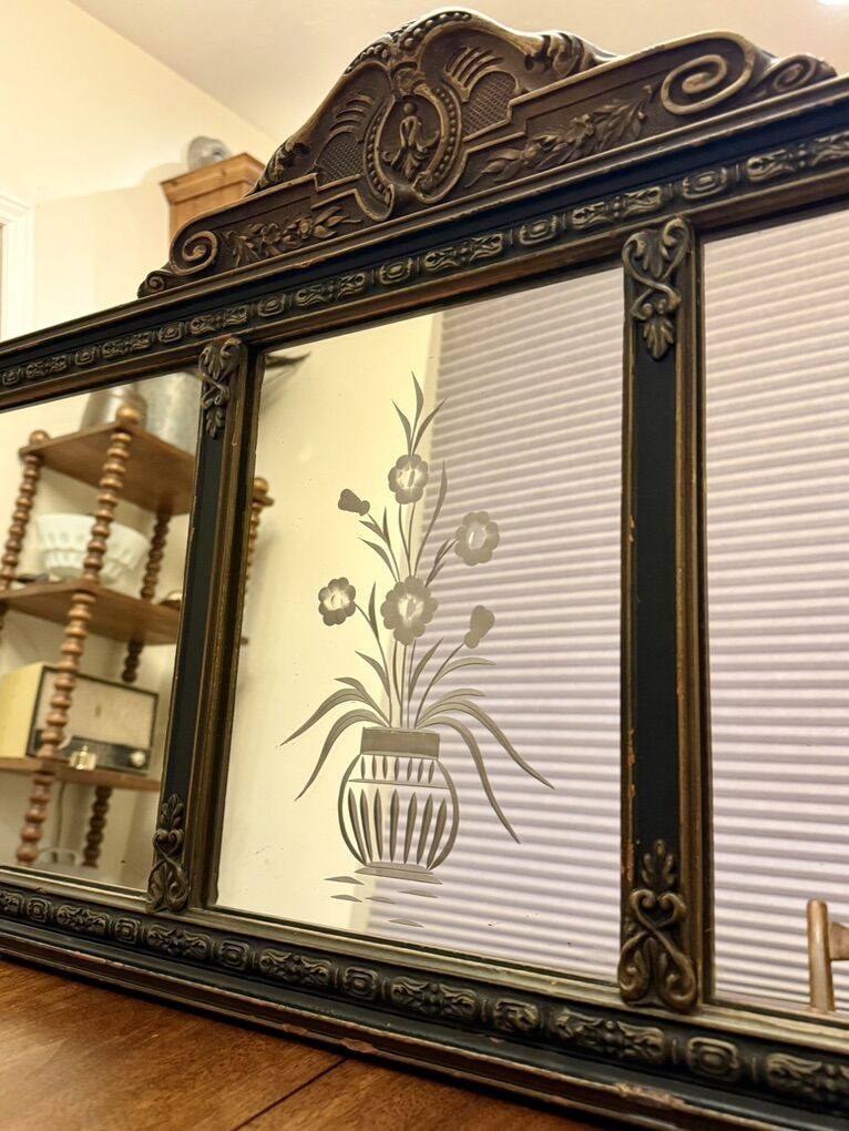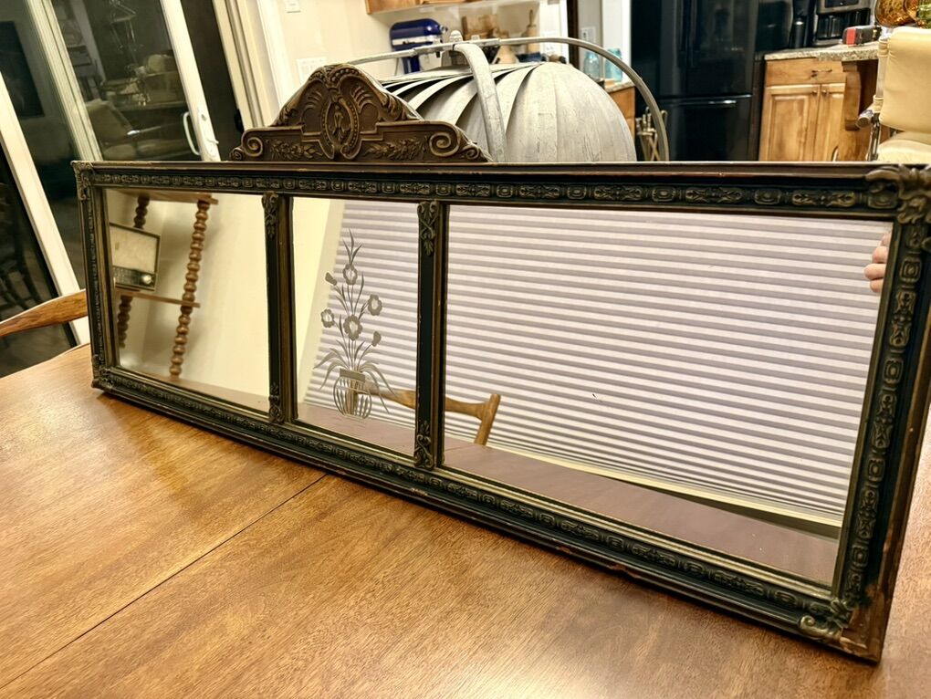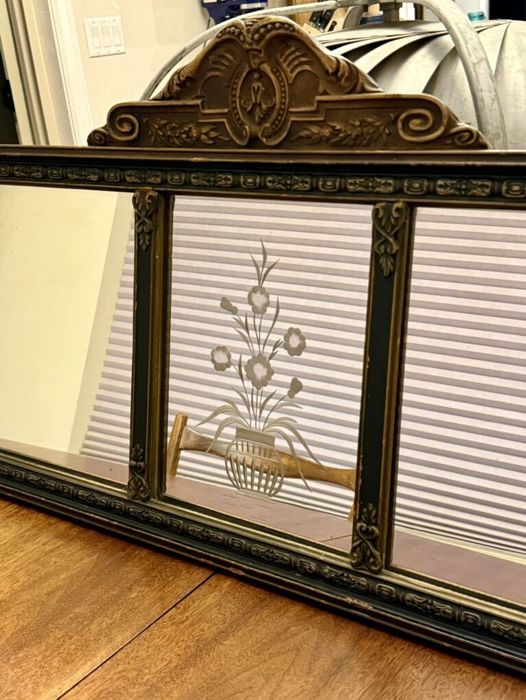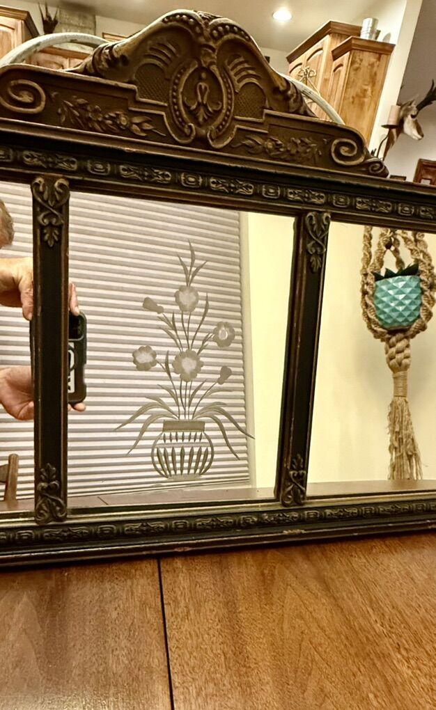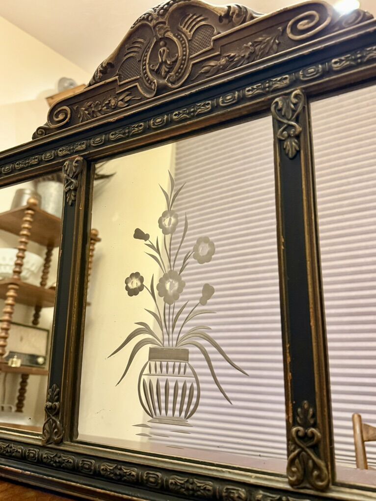 Venmo1930’s etched 3 panel piano mirror. Has slight damage in bottom right corner showing pictures .